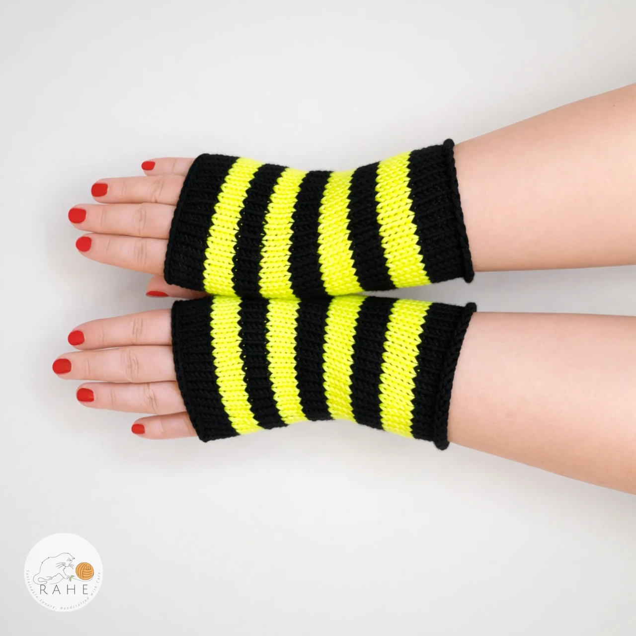 Turn heads with these neon yellow and black striped fingerless gloves, hand-knitted from soft extra fine Italian merino wool.