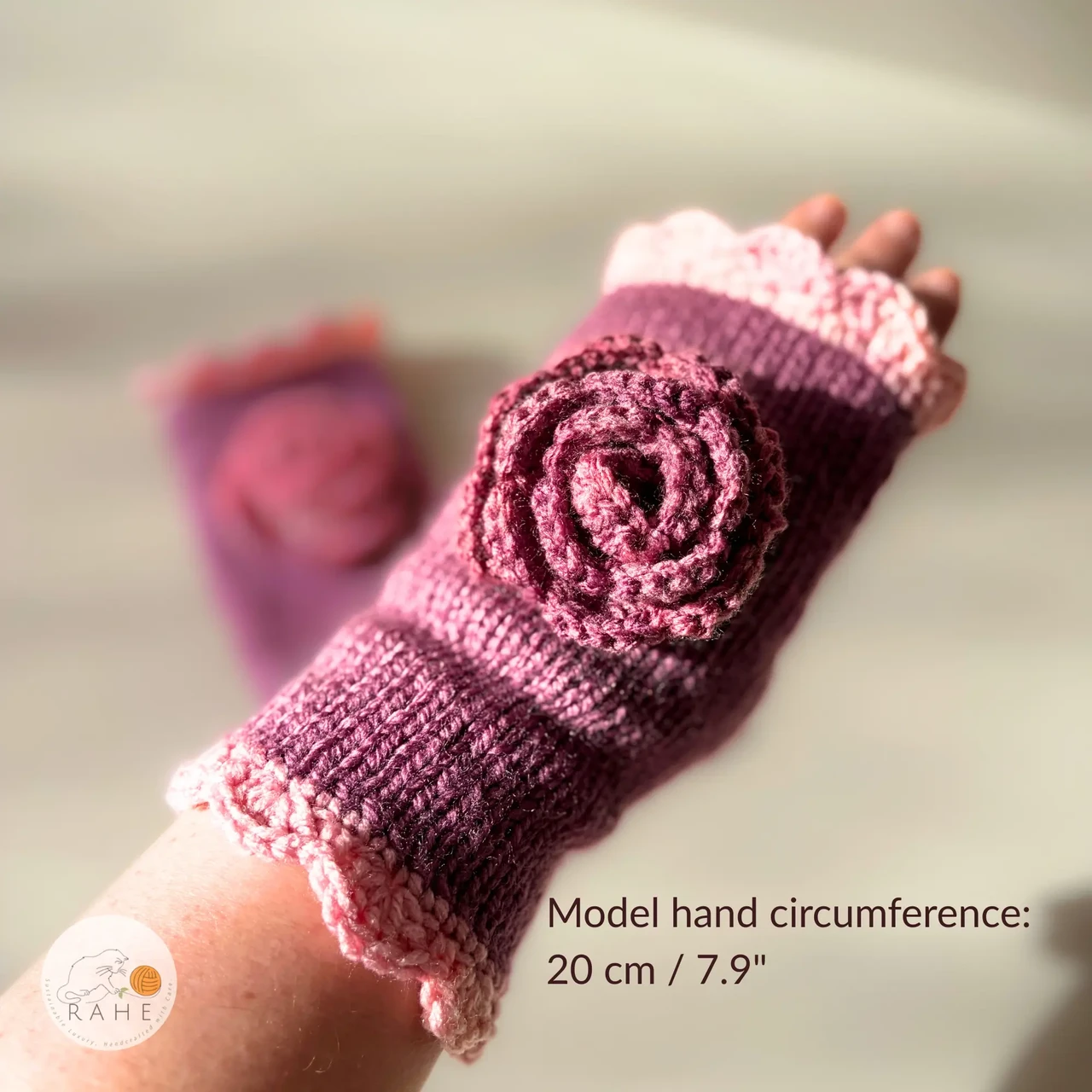 These hand-knitted fingerless gloves / wrist warmers are made from soft and durable acrylic yarn. The design is finished with a handcrafted crochet flower and a contrasting lace edge that gently frames the knit with a delicate and playful touch.