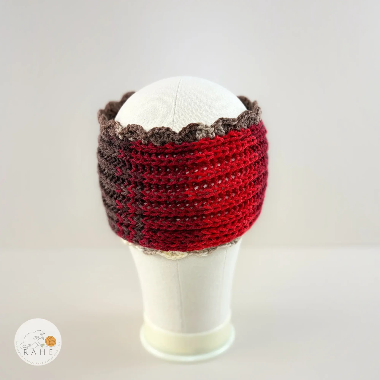 This hand-knitted headband blends taupe and red tones in a calm, harmonious gradient. The piece reflects a naturally feminine and romantic character while remaining easy to wear every day.