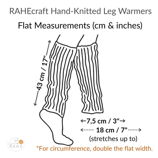 Measurements are taken with the leg warmers lying flat. Double the flat widths to estimate the circumference.
