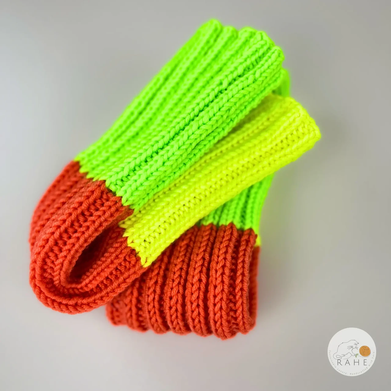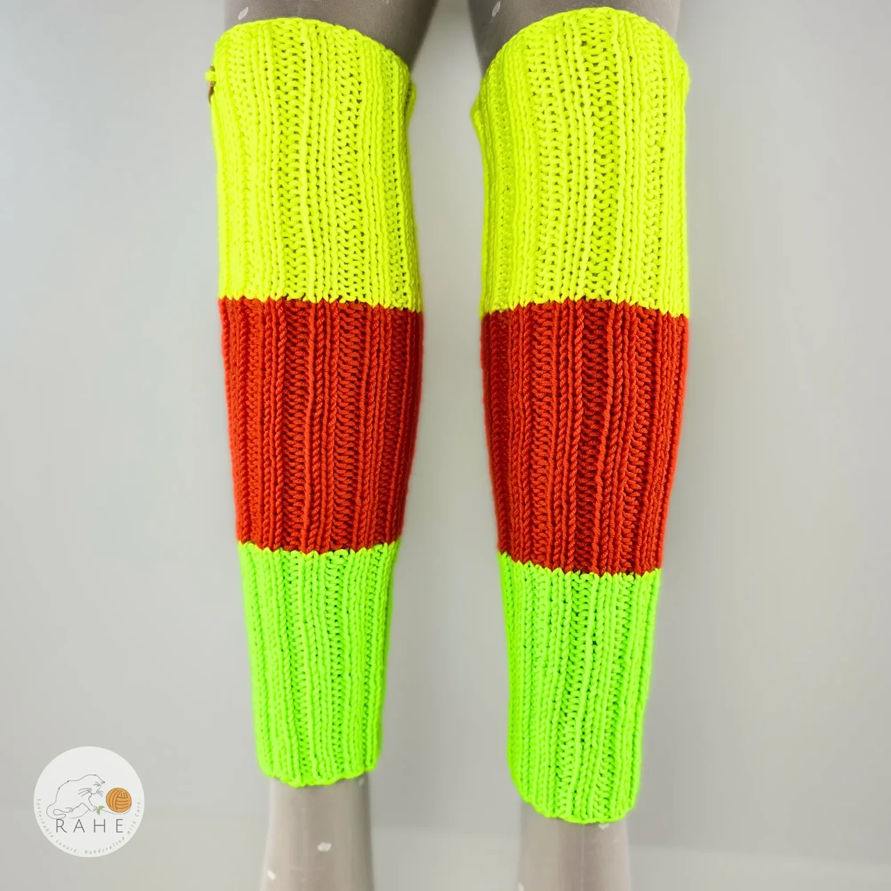 Hand-knitted merino leg warmers, neon yellow, orange, green