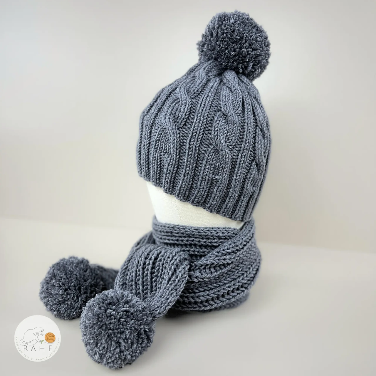 Hand-knitted merino scarf, reflective pom-poms, dark grey