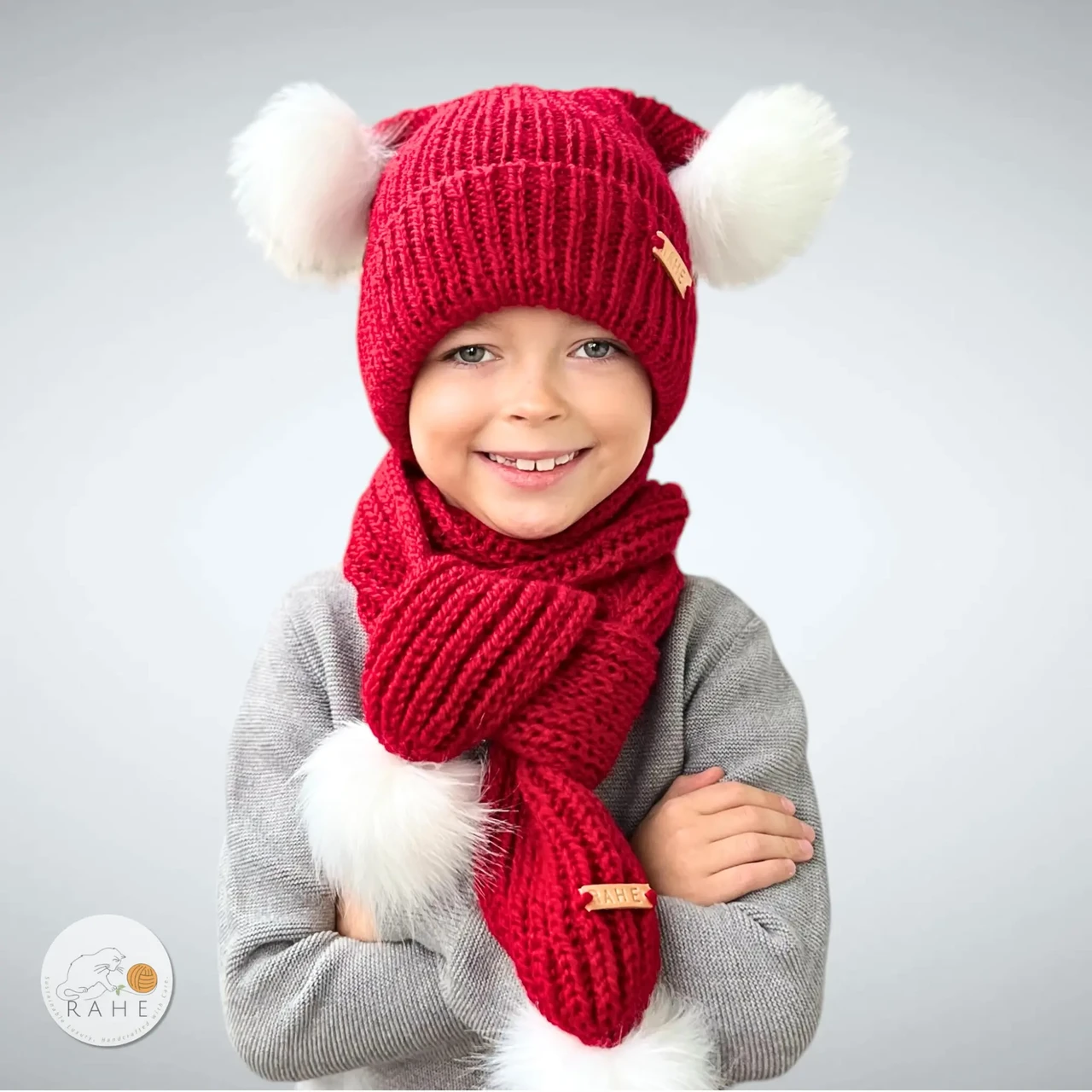 Hand-Knitted Red Winter Hat and Scarf Set for Kids, Teens & Adults