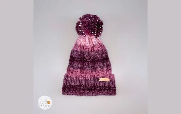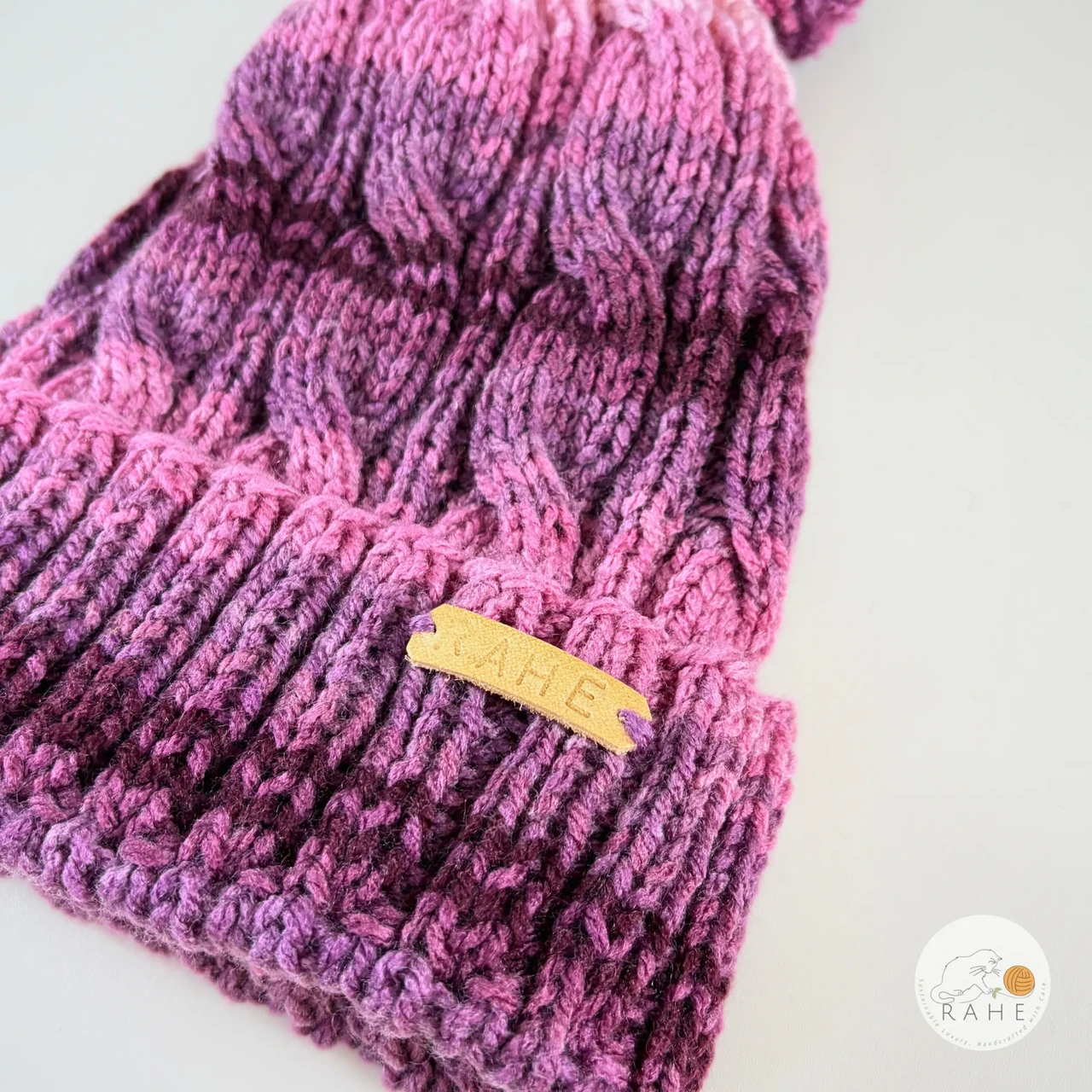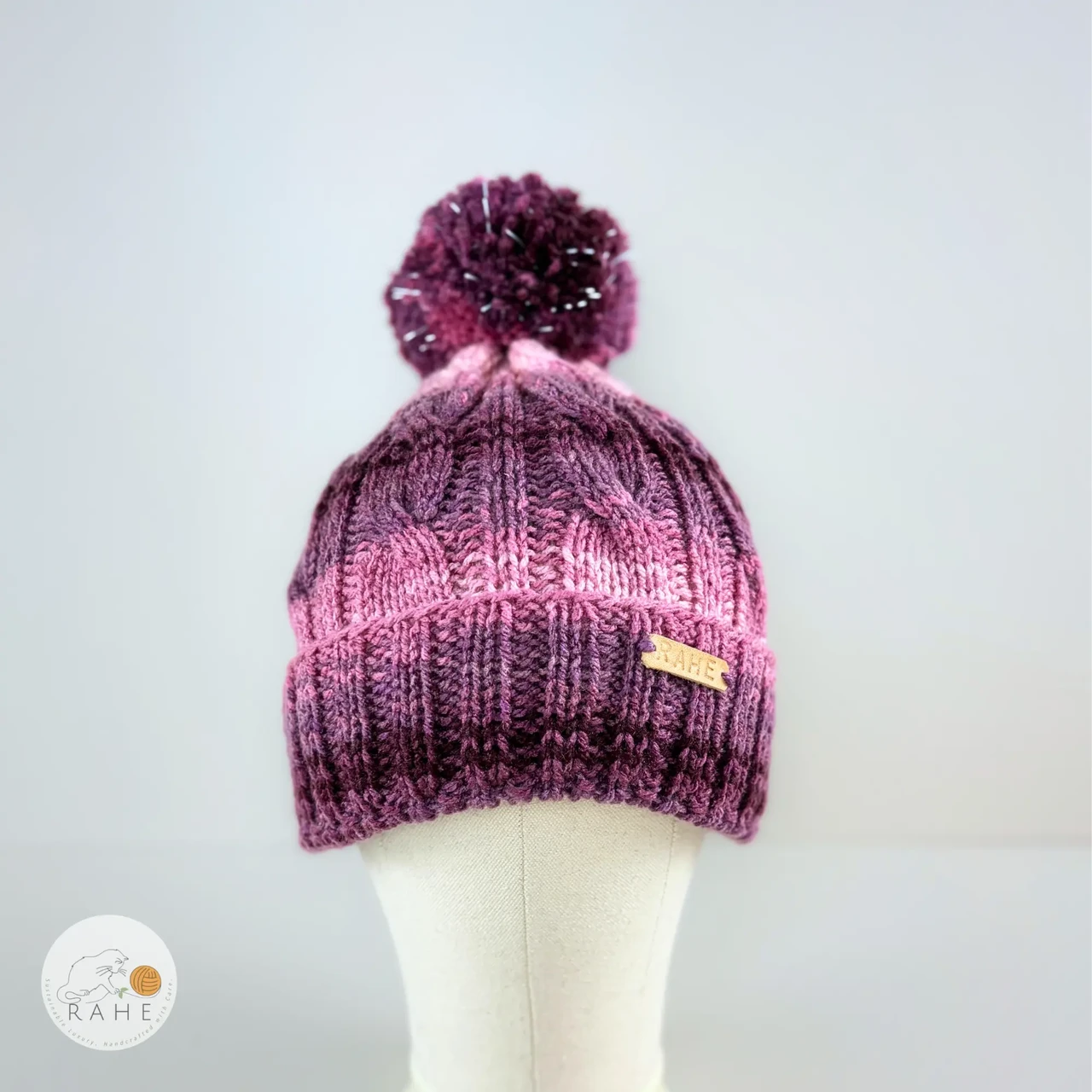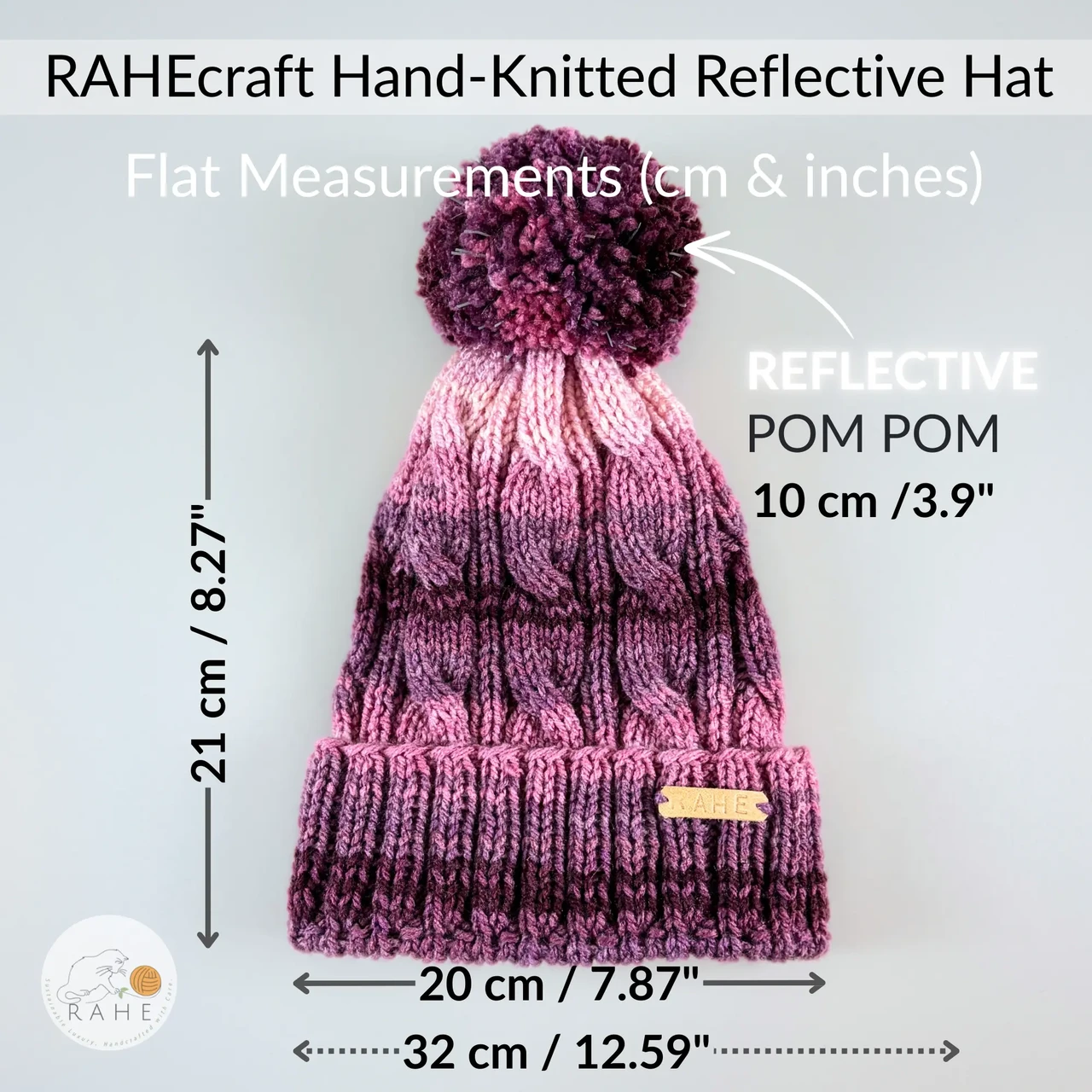 Cozy, classic, and crafted to last — a hand-knitted gradient purple and pink cable knit acrylic hat with a non-slip double brim and with a soft and large reflective pom-pom.