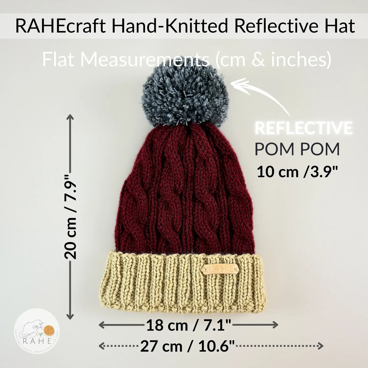 Hand-knit reflective pom pom hat - beige, burgundy, grey