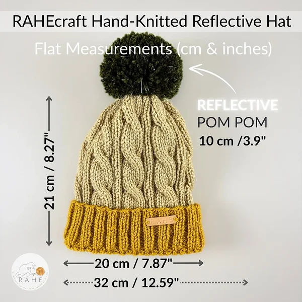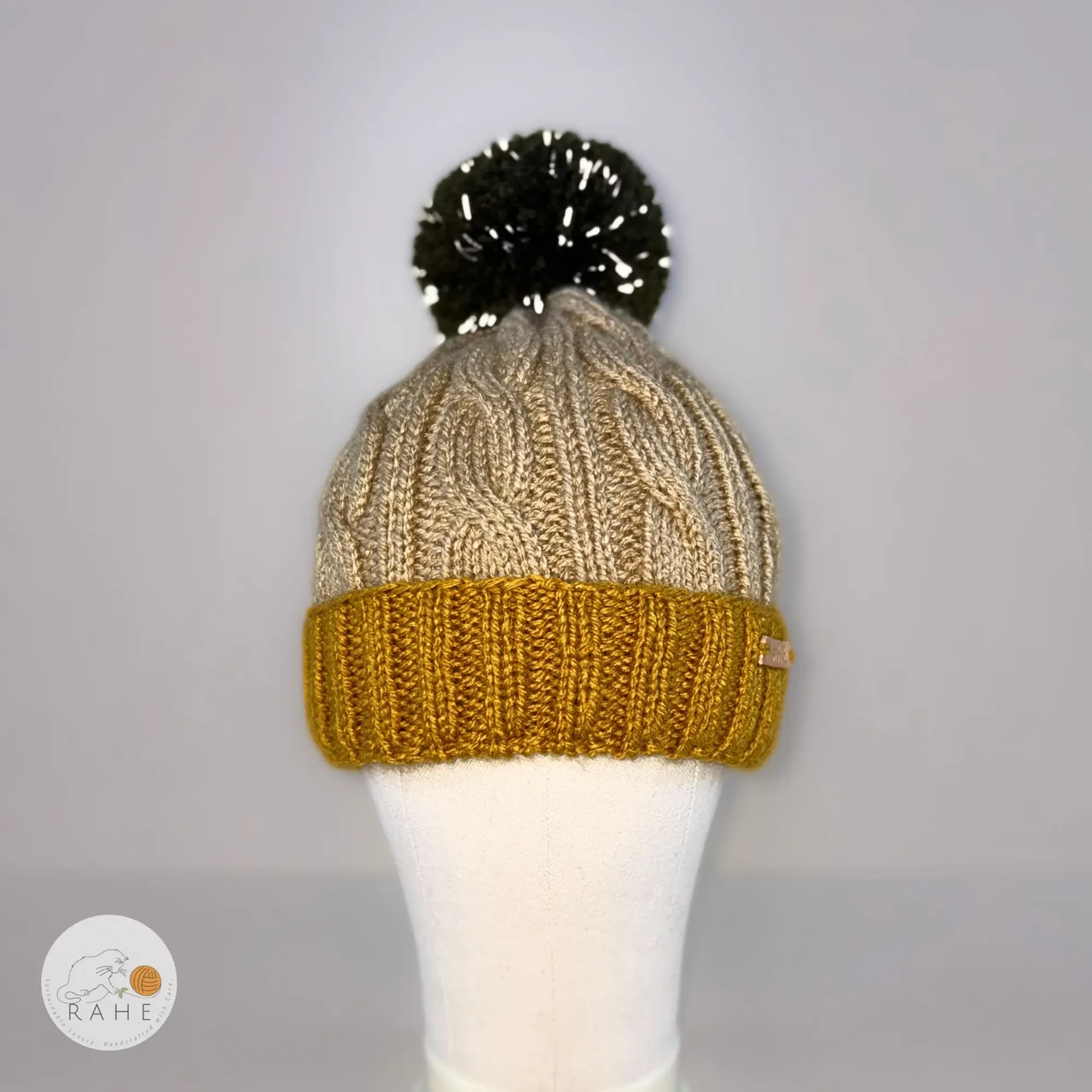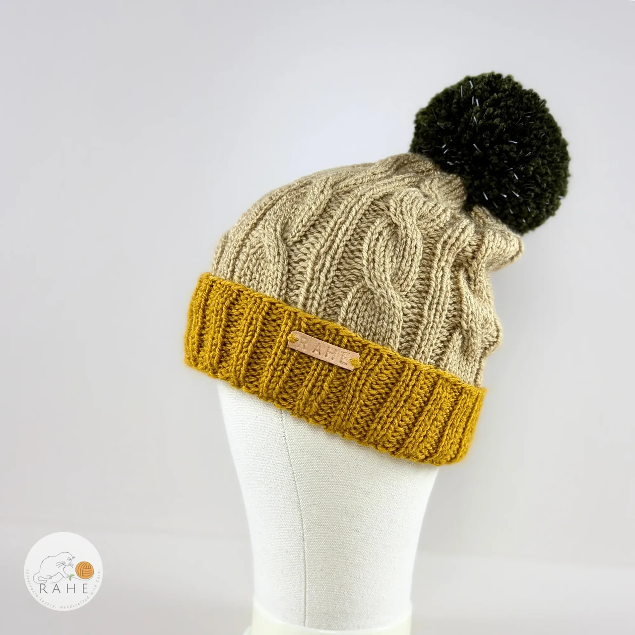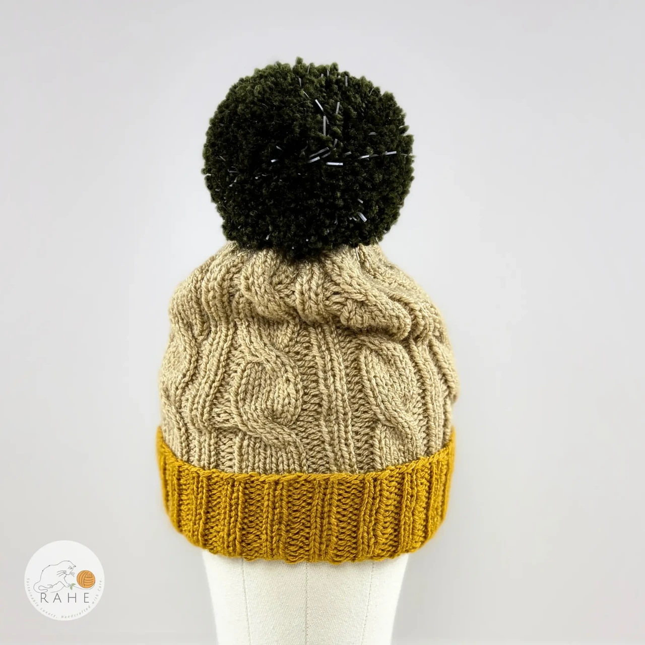 Cozy, classic, and crafted to last — a hand-knitted beige cable knit acrylic hat with a mustard yellow non-slip double brim and with a soft and large dark green reflective pom-pom.