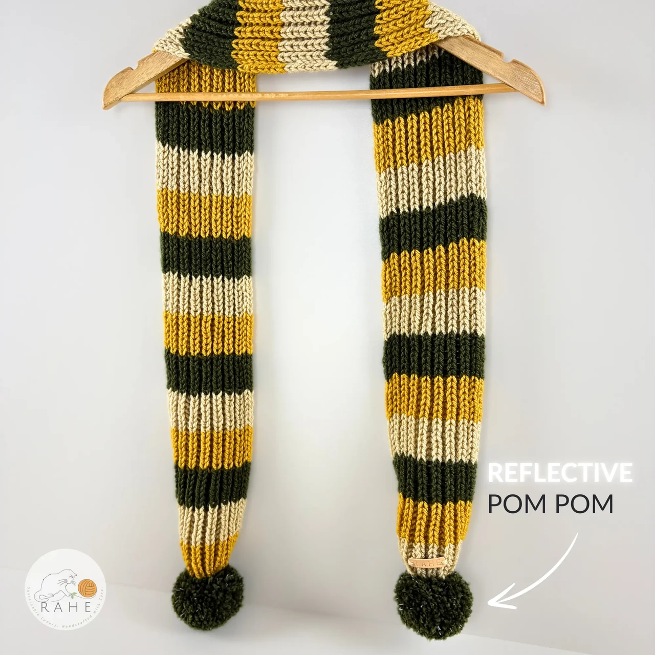 Hand-knit striped scarf, reflective poms - beige, mustard yellow, dark green