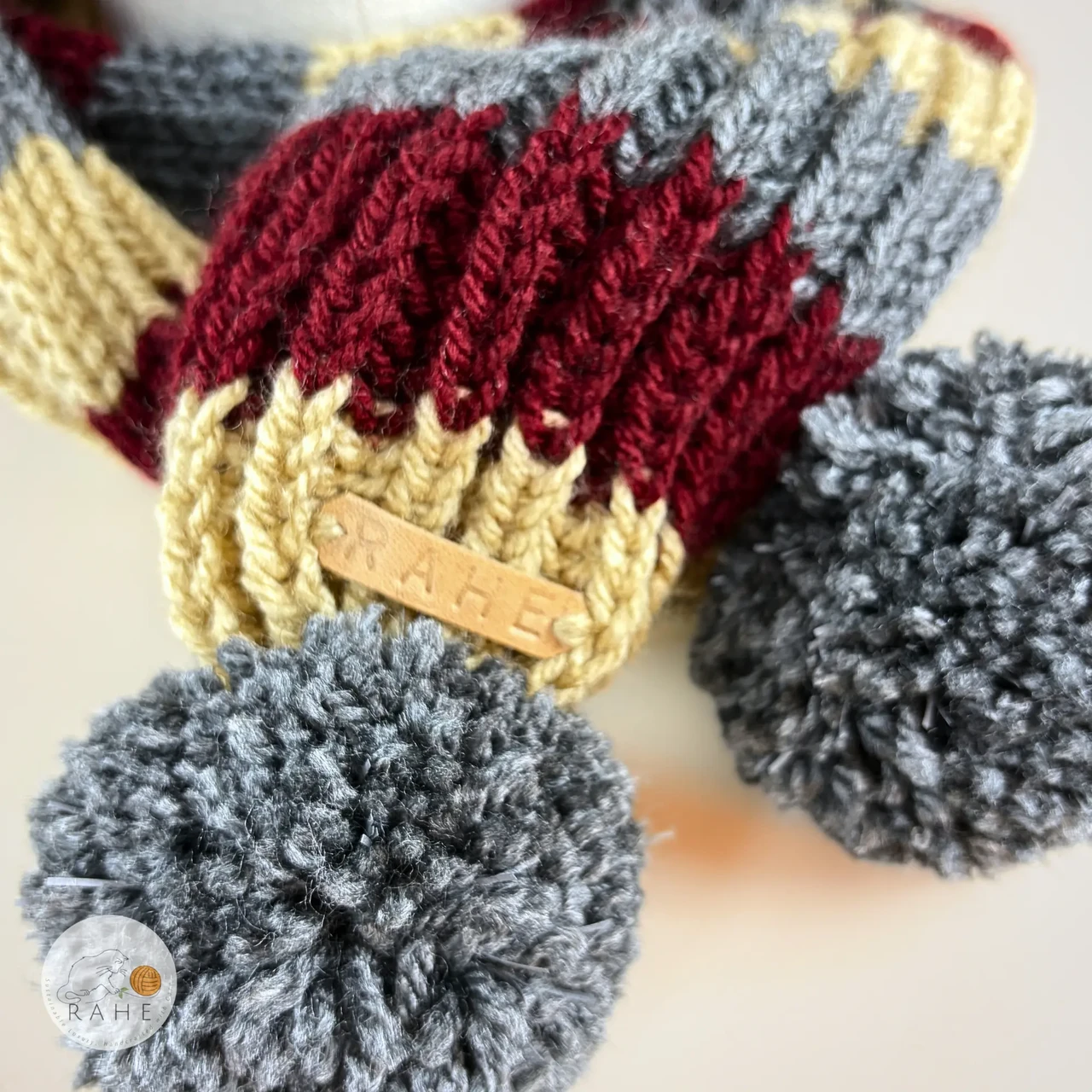 Hand-knit striped scarf, reflective poms - beige, burgundy, grey