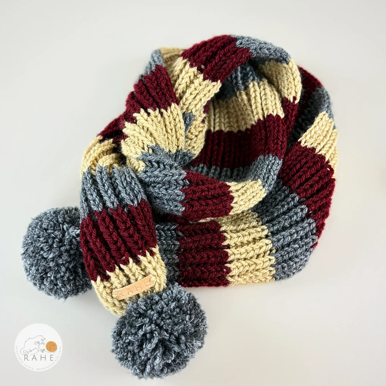 Cozy, classic, and crafted to last — this vintage look striped hand-knitted fisherman-knit scarf with reflective pom poms is made from beige, dark red, and grey acrylic yarn.
