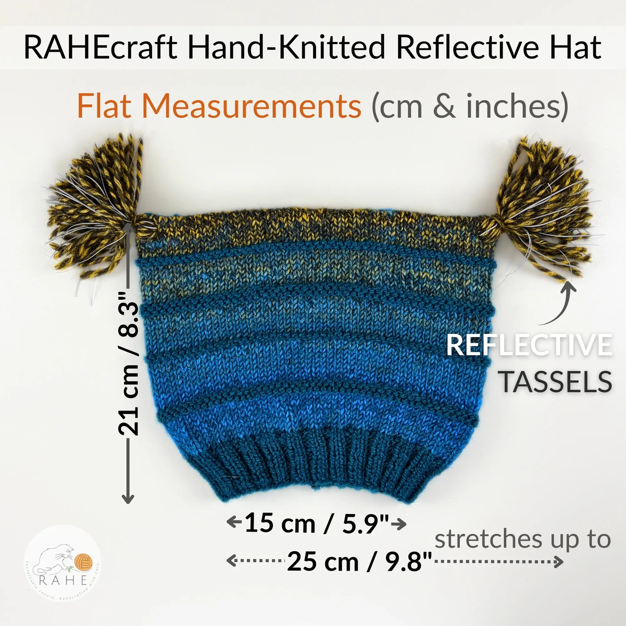 This RAHEcraft hand-knitted reflective beanie blends rich blue-teal and brownish tones into a soft gradient, accented with subtle striped knitting.