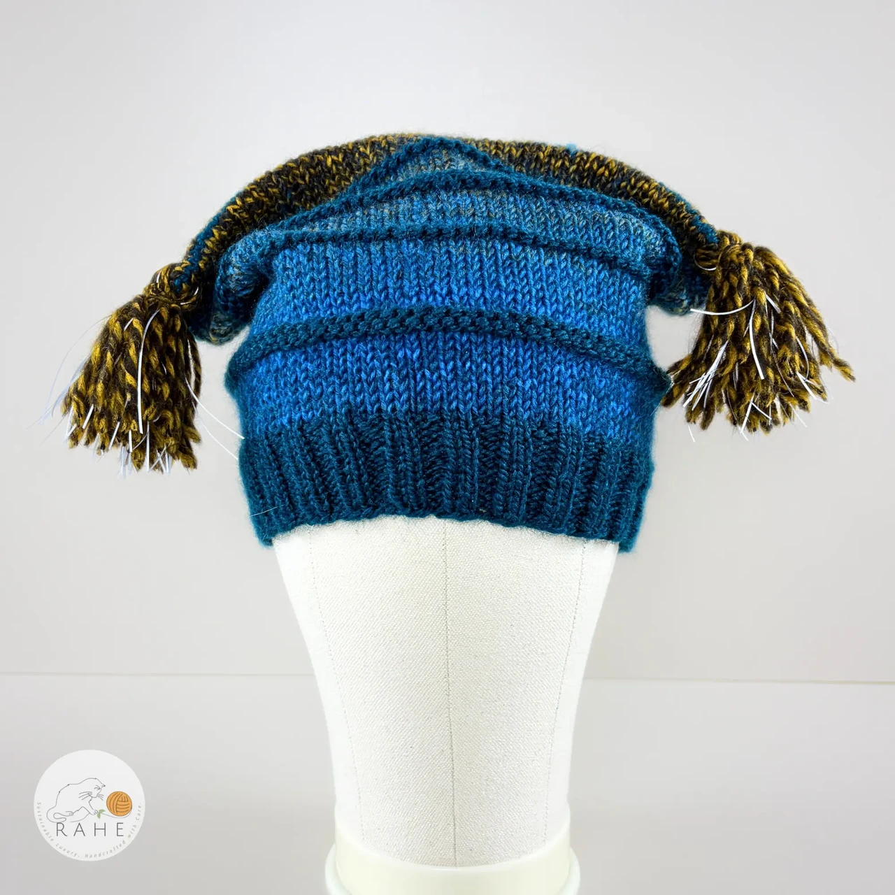 Also featured on Pinterest: hand-knitted gradient blue and brown hat with reflective tassels