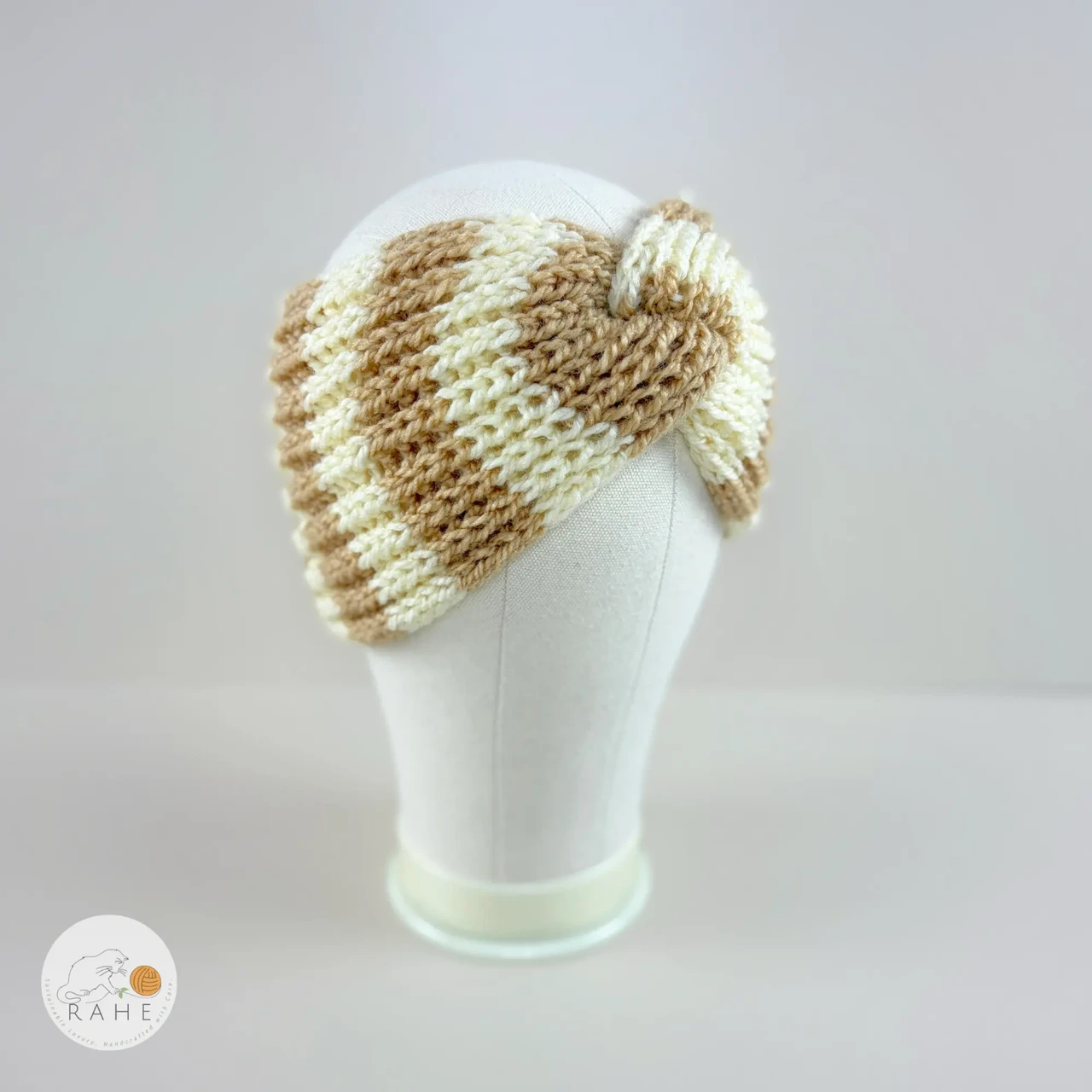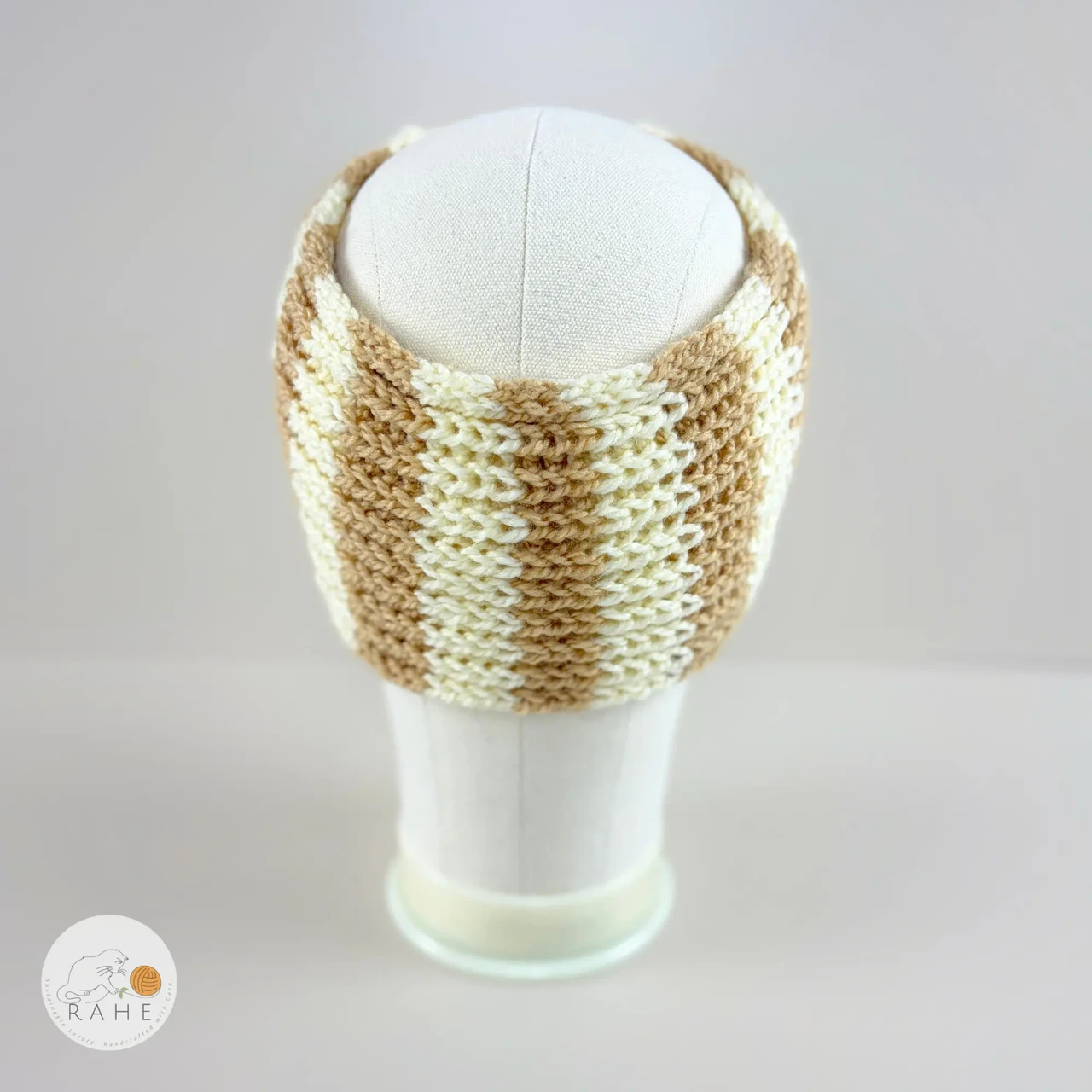A warm and light tone inspired by sandy shores and softly diffused winter light. This beige and natural white striped hand-knitted headband is a timeless and calming colour choice that pairs effortlessly with any wardrobe, adding softness and balance to your look.