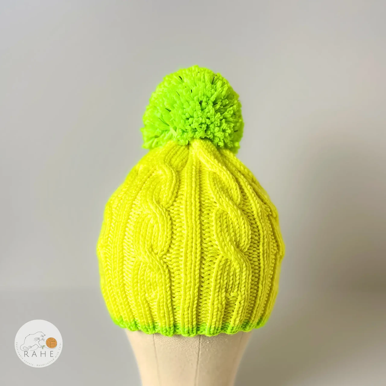 Kids Winter Hat, hand-knitted reflective merino bobble hat, neon yellow