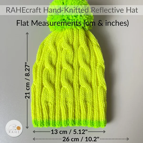 Each hat is hand-knitted in Estonia using a classic cable pattern that also acts as a natural ribbing, ensuring a stretchy and secure fit that stays comfortably in place. The reflective yellow pom-pom adds extra visibility on darker days – perfect for school walks, skiing trips, or evening playtime.
