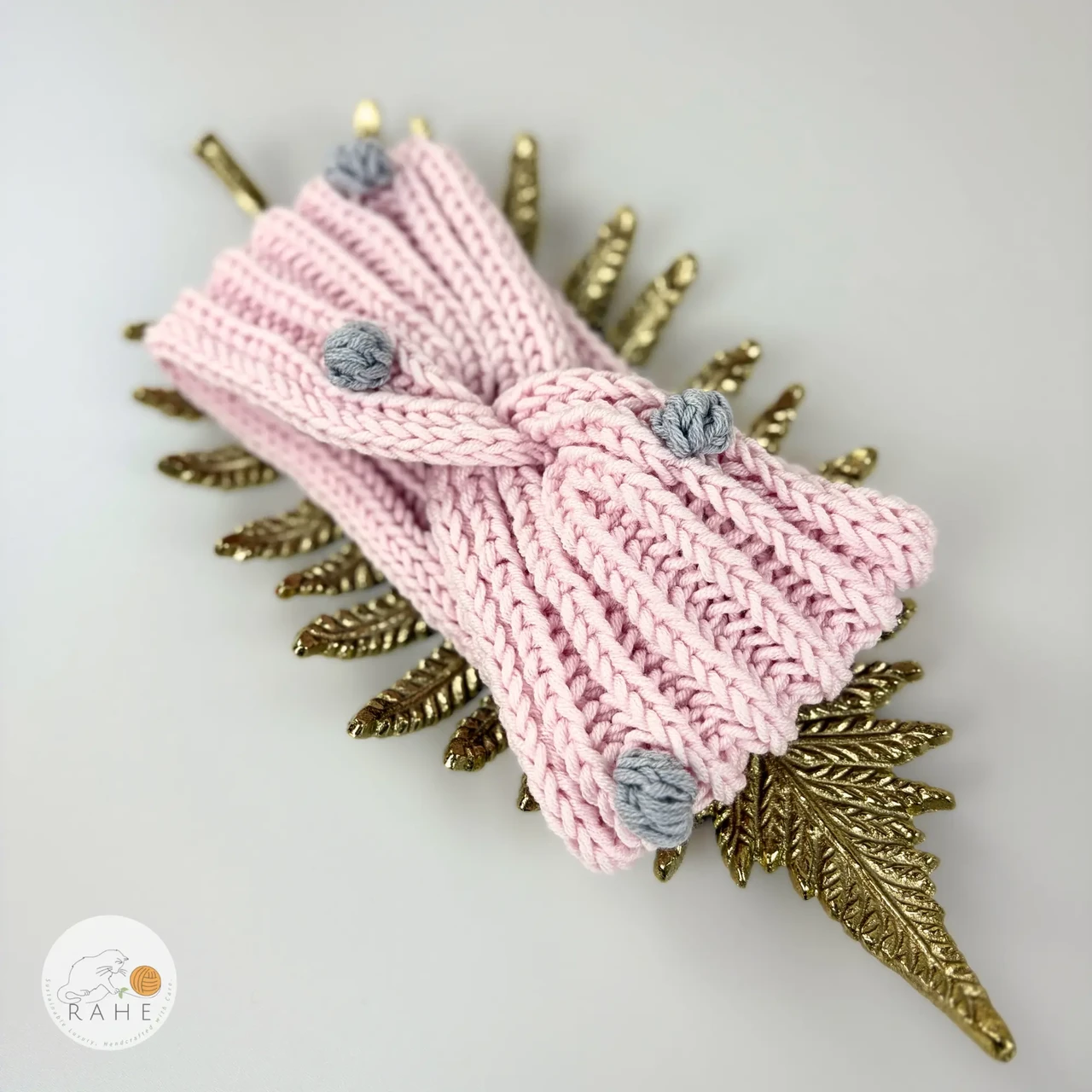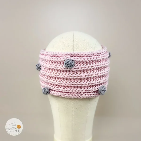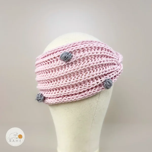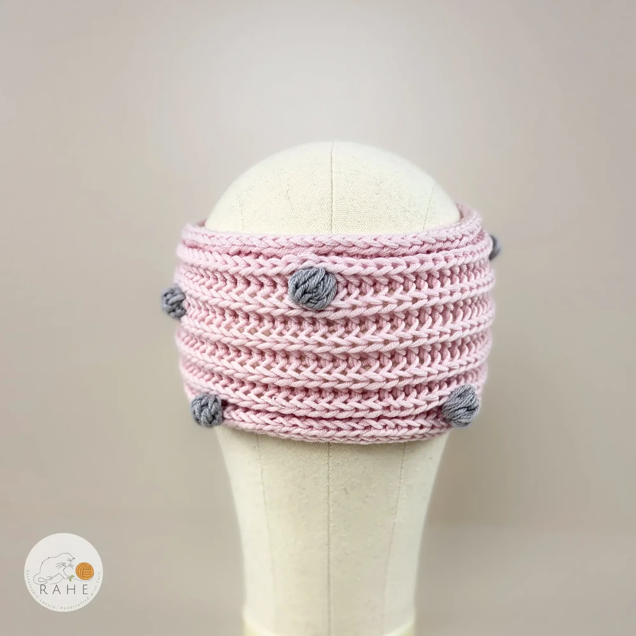 Hand-Knitted Light Pink Merino Wool Headband, Grey Popcorn
