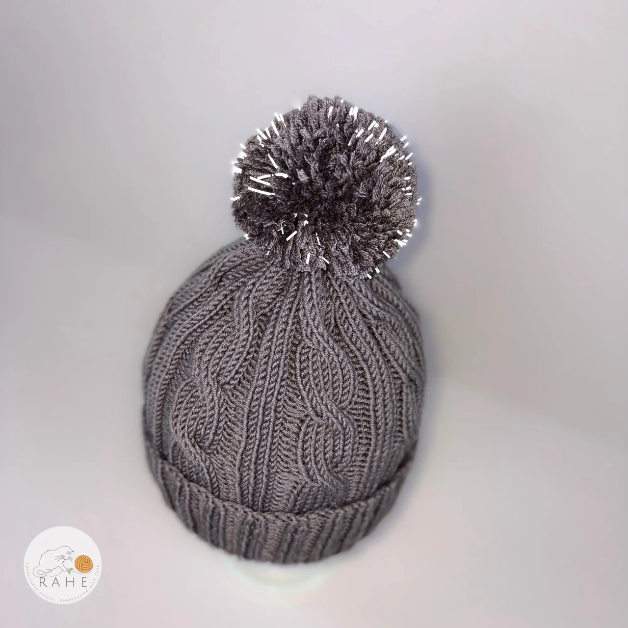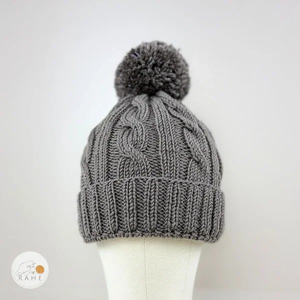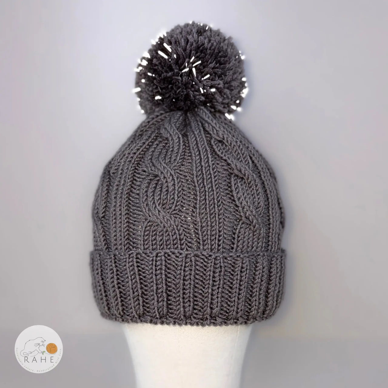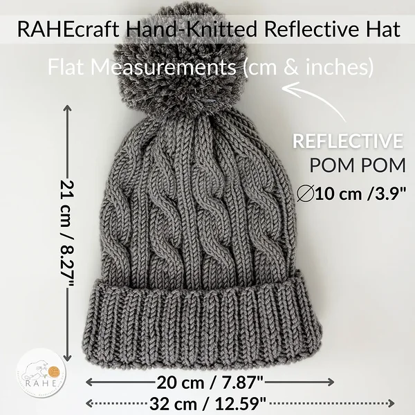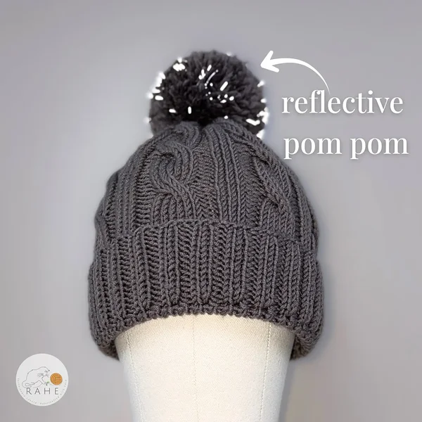 Cozy, classic, and crafted to last — a hand-knitted grey cable knit merino wool hat with a non-slip double brim and with a soft and big drey reflective pom-pom.