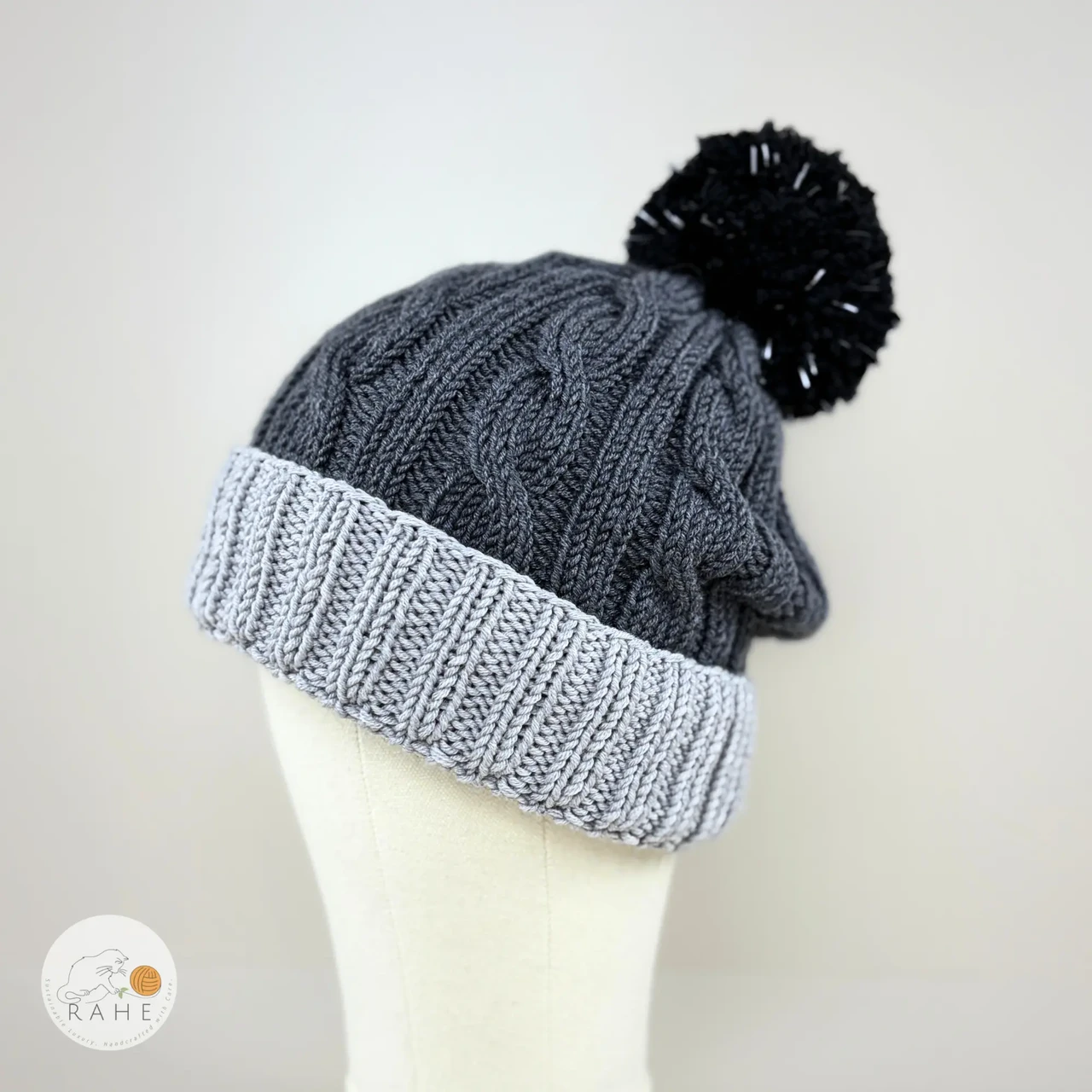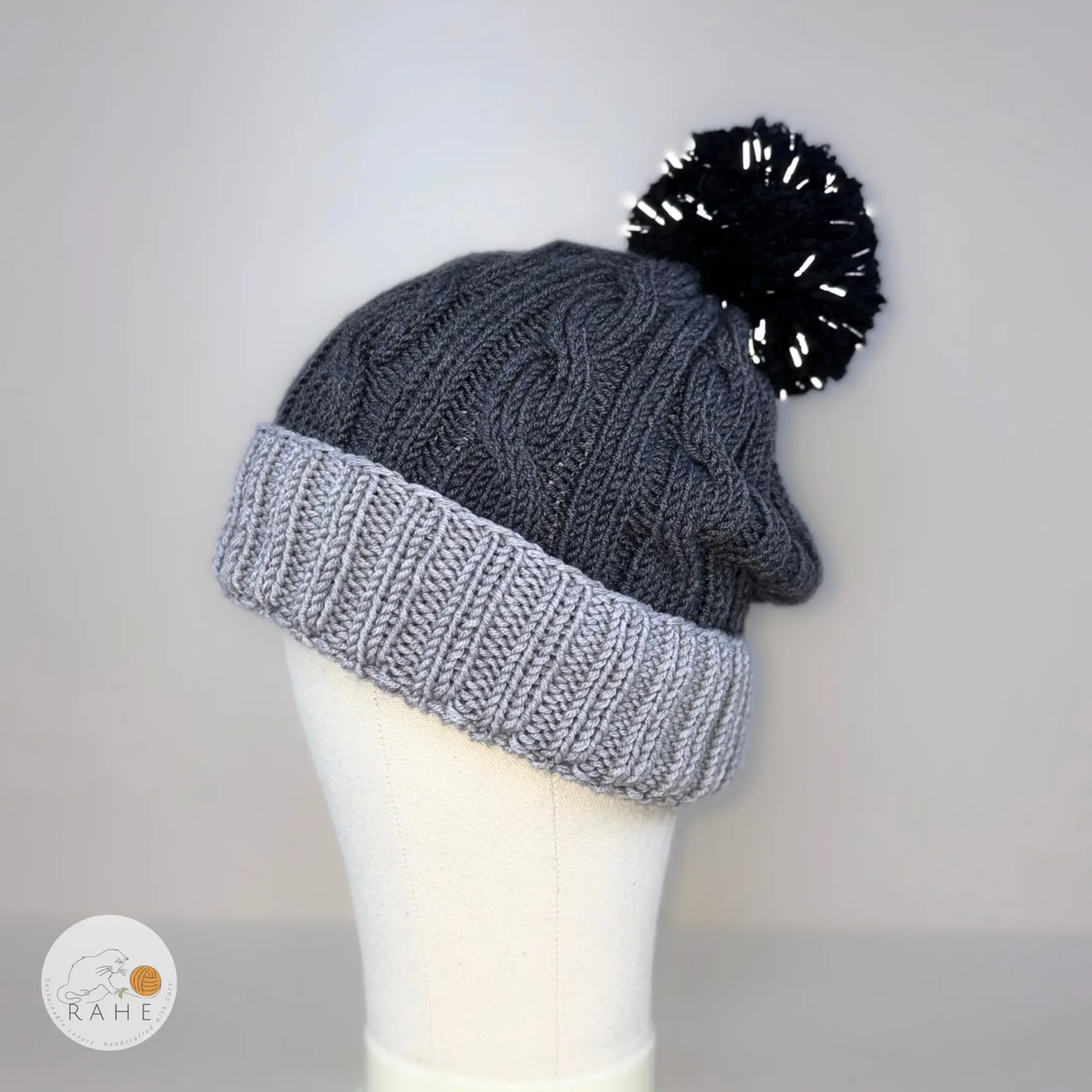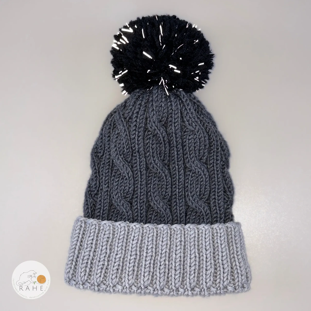 Cozy, classic, and crafted to last — a hand-knitted charcoal cable knit merino wool hat with a non-slip light grey brim and with a soft and big black reflective pom-pom.