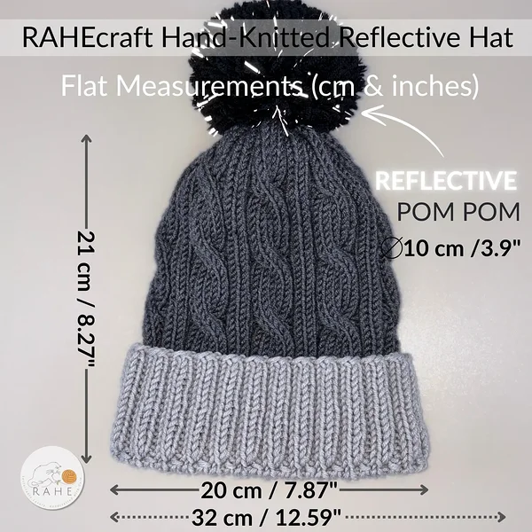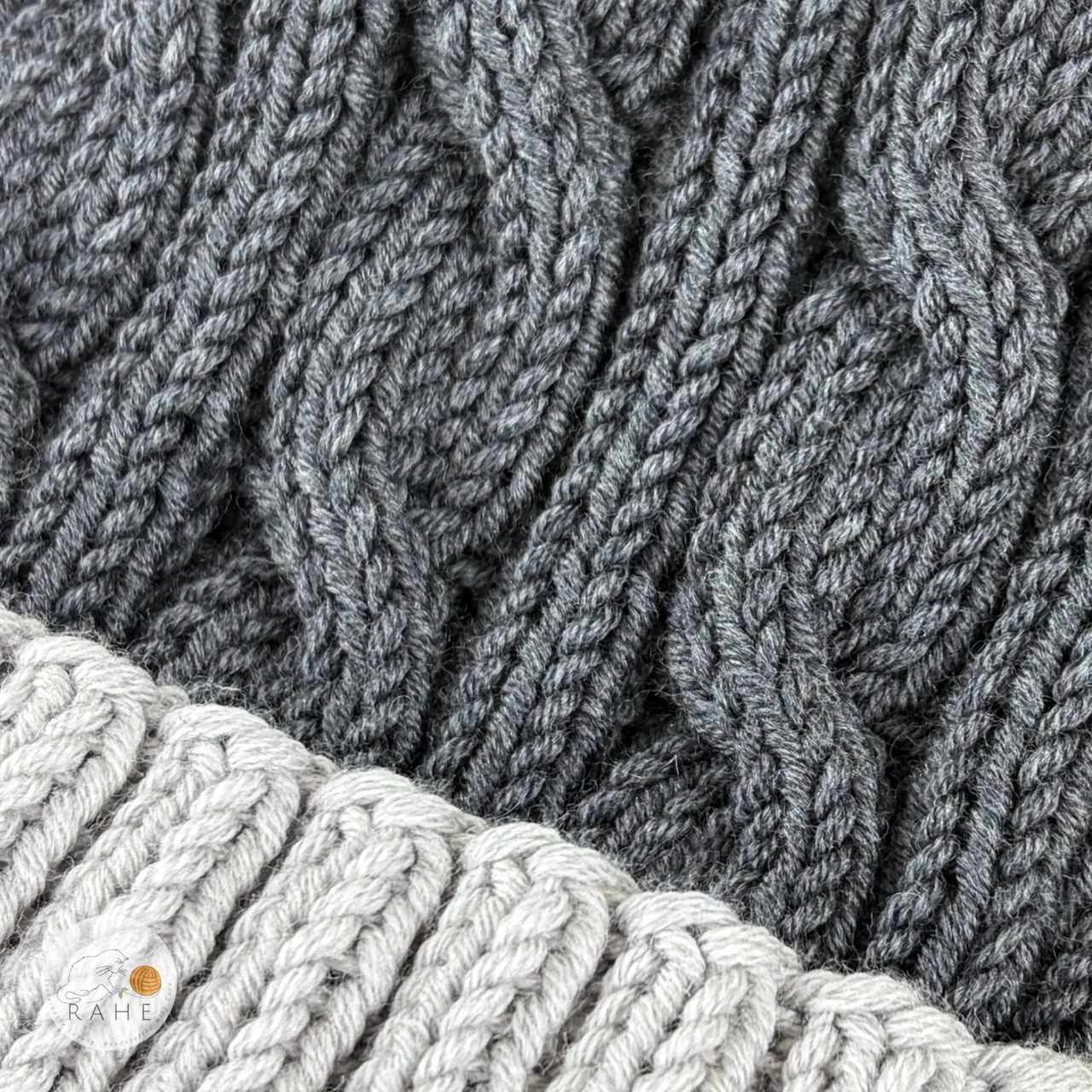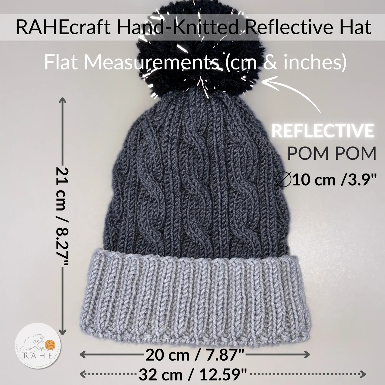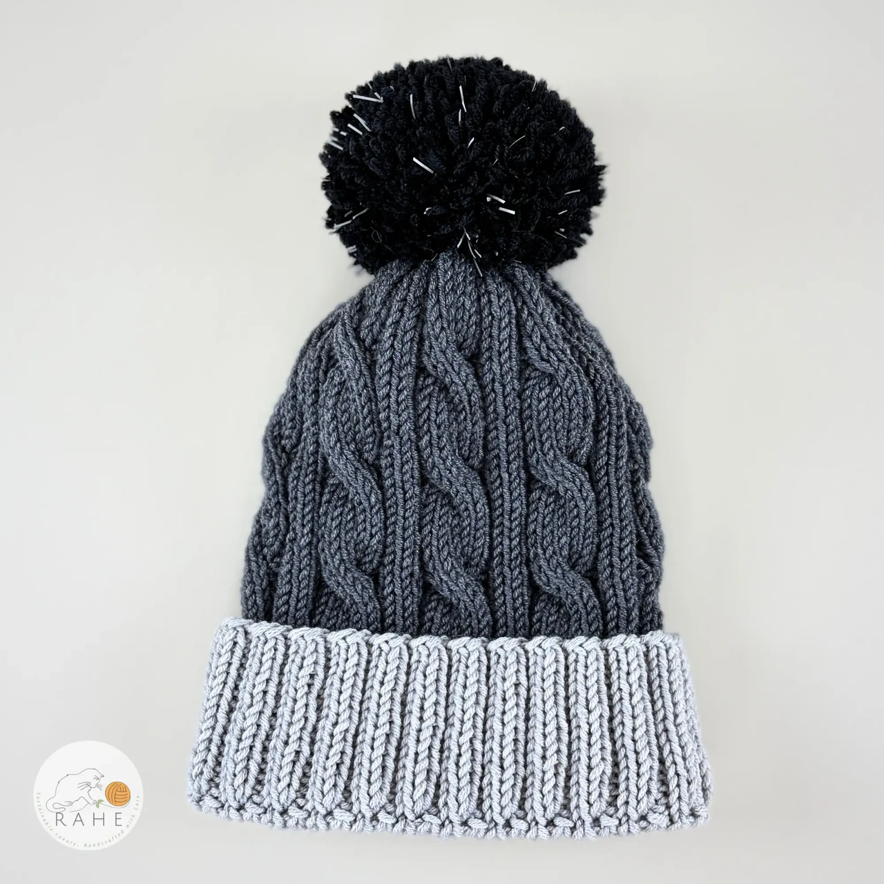 Cozy, classic, and crafted to last — a hand-knitted charcoal cable knit merino wool hat with a non-slip light grey brim and with a soft and big black reflective pom-pom.