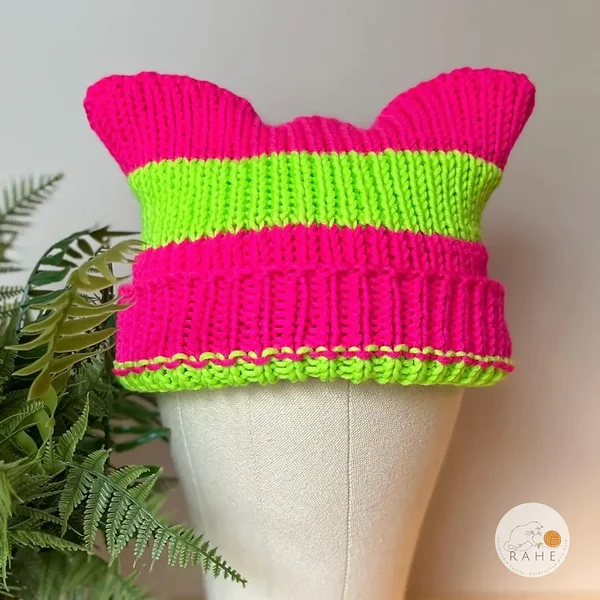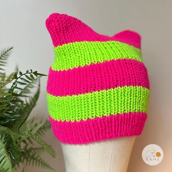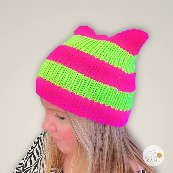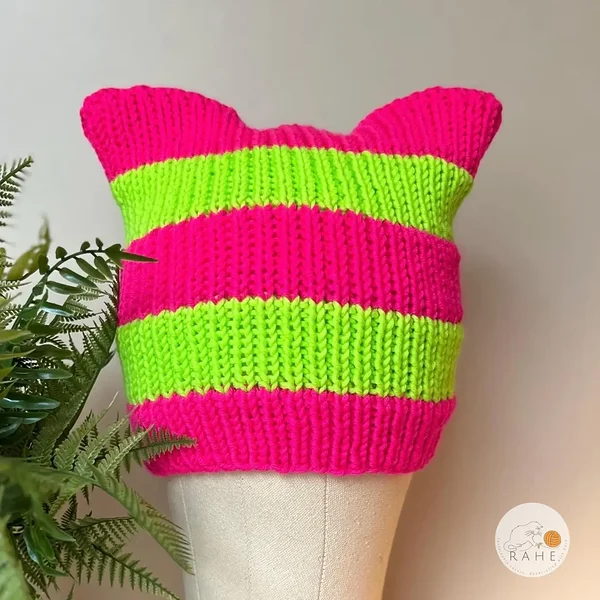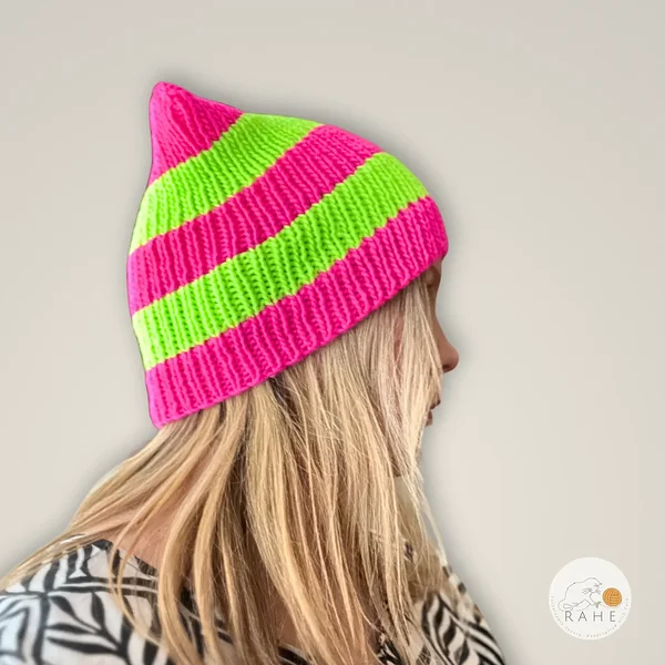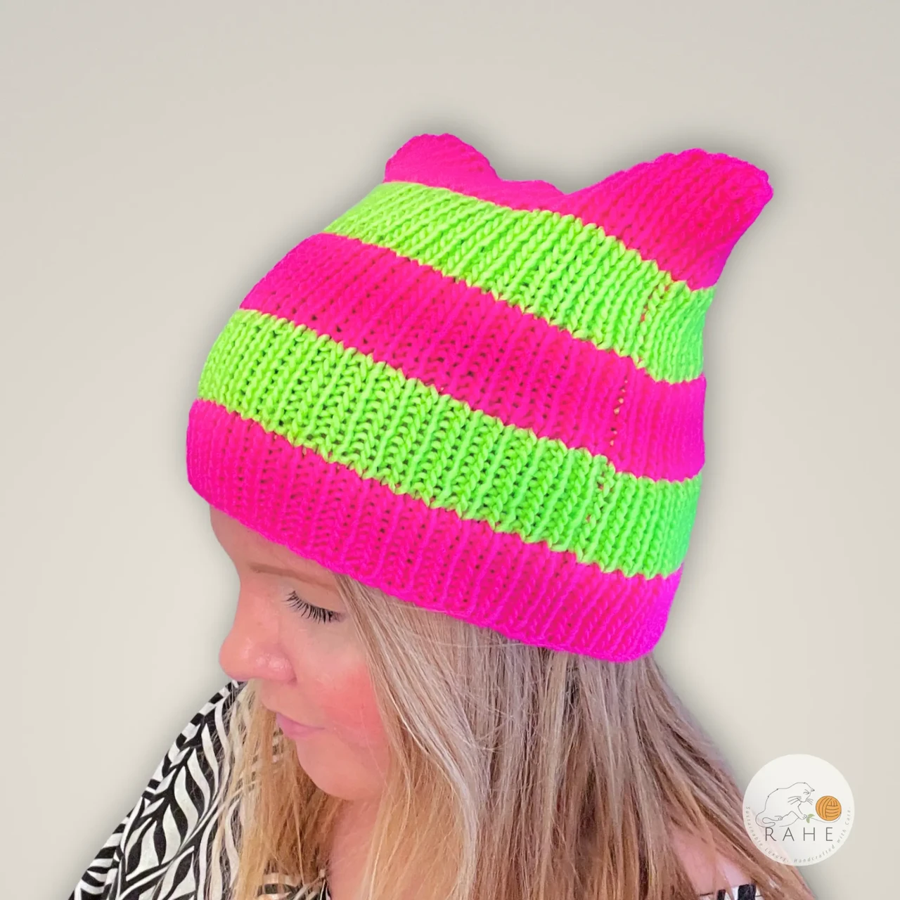 Hand-knitted merino wool winter hat for ladies, striped neon pink & green