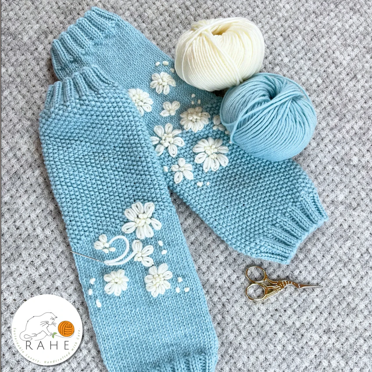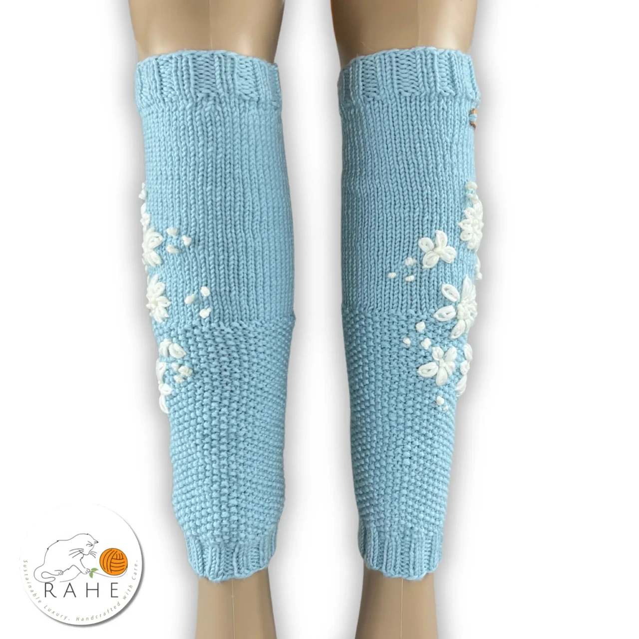 Hand-knit & Embroidered Merino Wool Light Blue Legwarmers