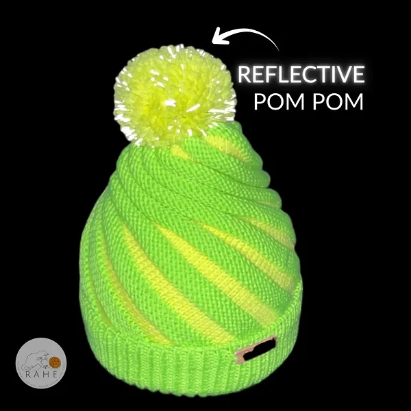 Crafted from premium Italian merino wool, it features a vibrant swirl design with a reflective pompom to enhance safety on darker days. The ribbed non-slip brim stretches comfortably but stays in place — no slipping over the eyes. Perfect for school mornings, snowy holidays, or neon-loving adventurers.