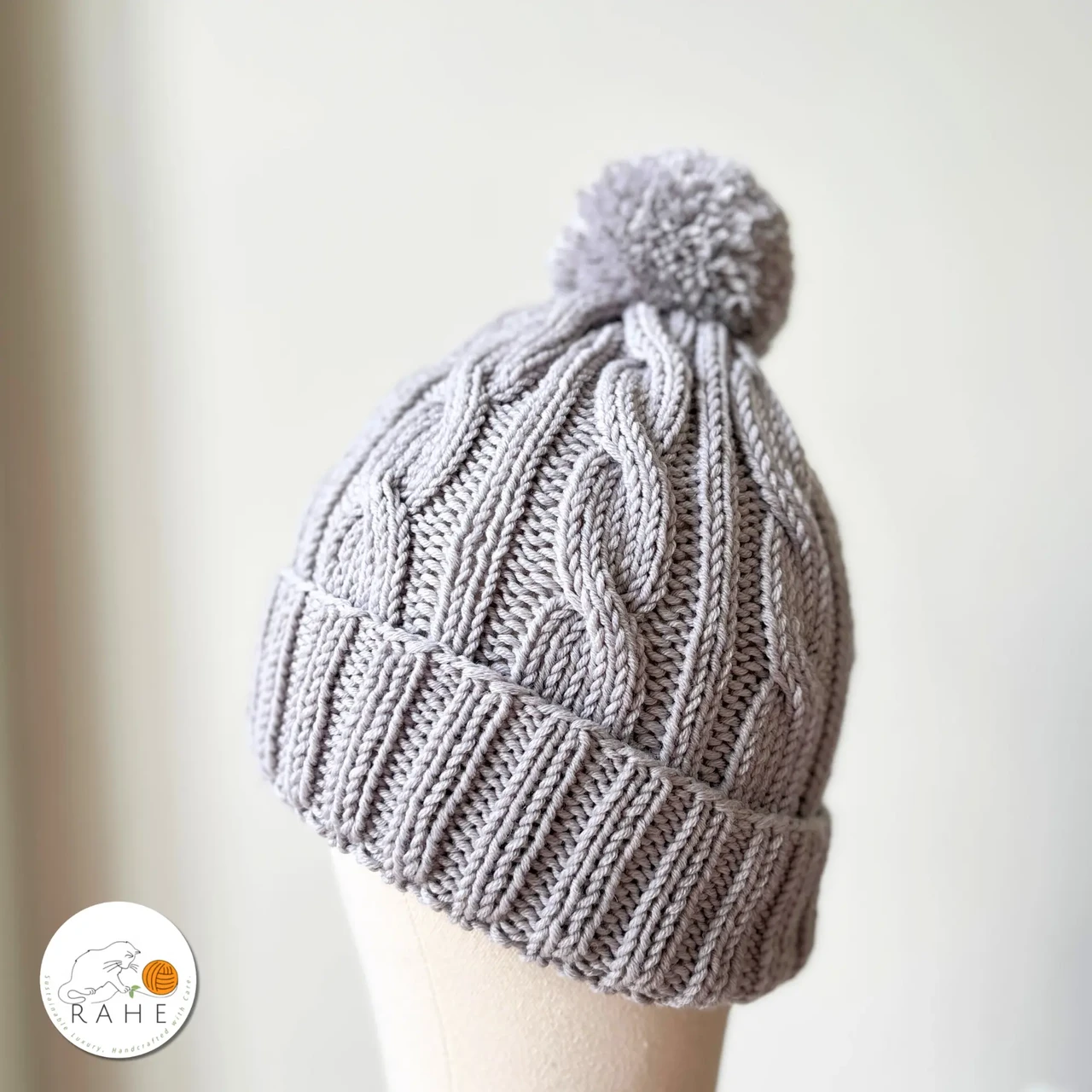 Meriino helkurmüts lastele, teismelistele, väikest kasvu täiskasvanutele. Hall palmikkoes pehme, veniv ja soe tutimüts.