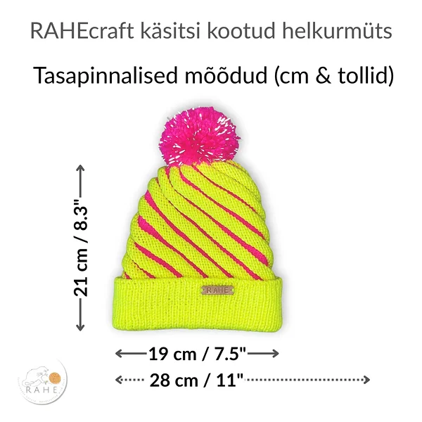 Meriinovillane lastemüts helkurtutiga – käsitsi kootud neoonkollane ja -roosa talvemüts