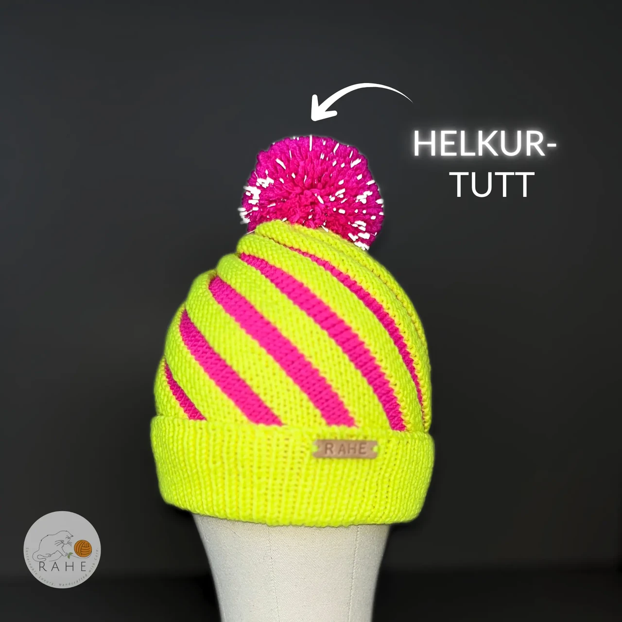 Mütsil on erksavärviline spiraalne triibuline muster ja helkurniite sisaldav meriinovillane tutt, mis lisab nähtavust pimedal ajal – ideaalne kooliteele või lumistele seiklustele.