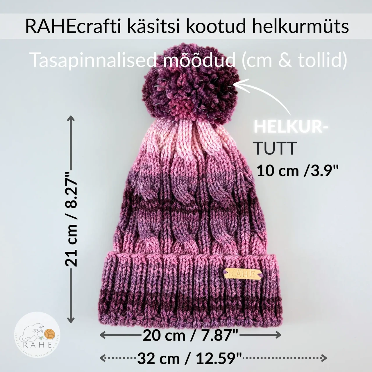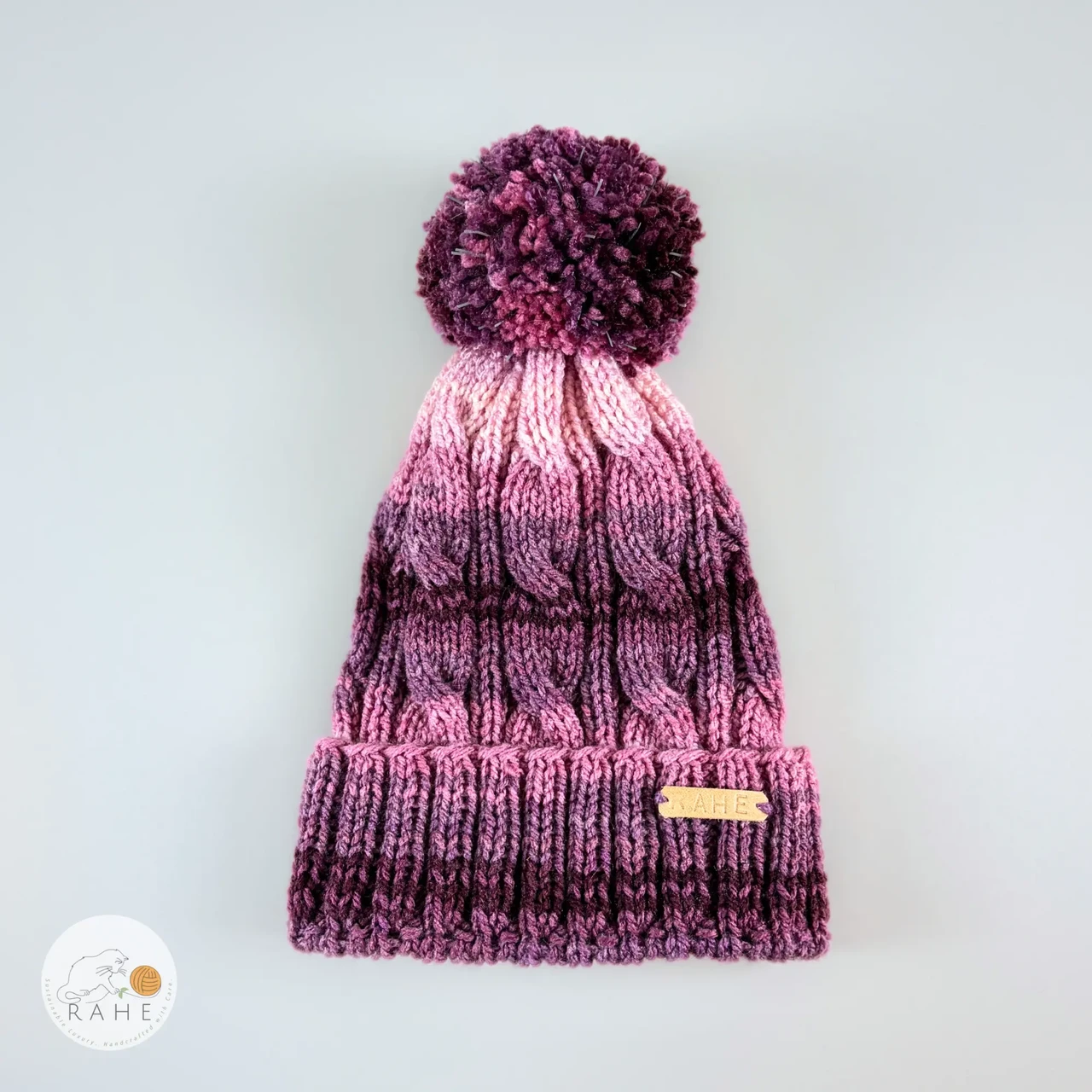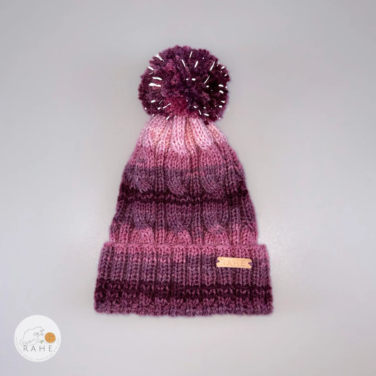 Käsitsi kootud roosa ja lillaga palmikkoes akrüüllõngast talvemüts, millel on kõrvu eriti hästi soojas hoidev kahekordne soonikäär ja mida kaunistab pehme ja suur helkurtutt.
