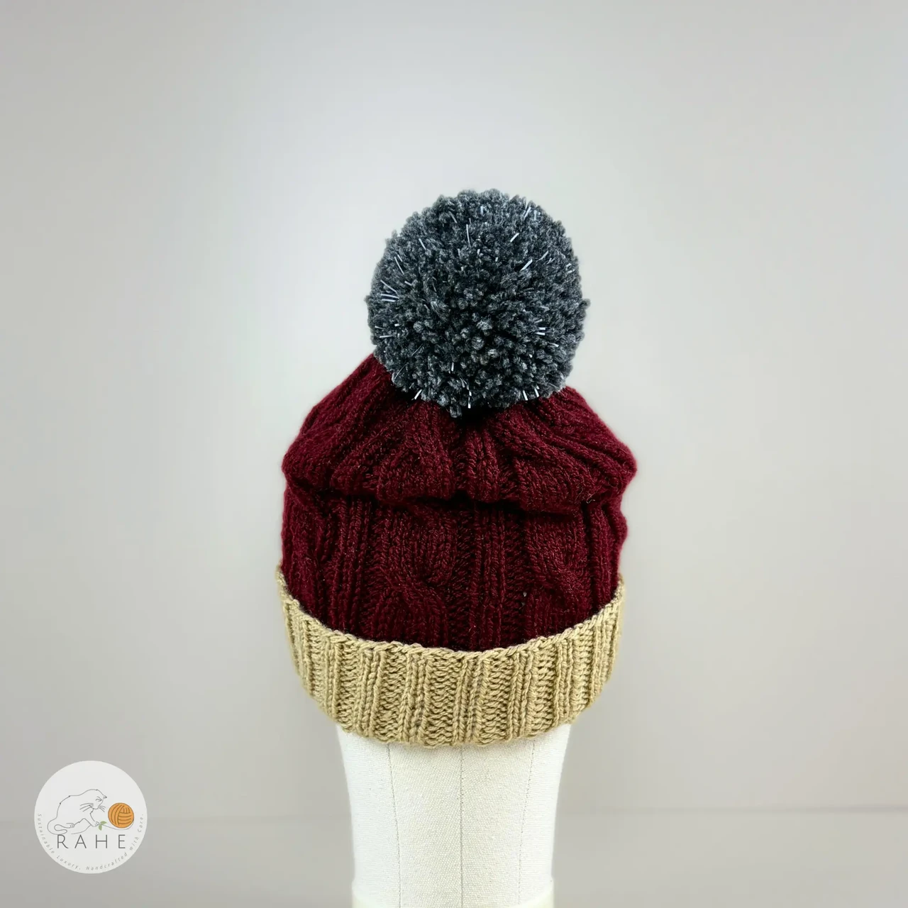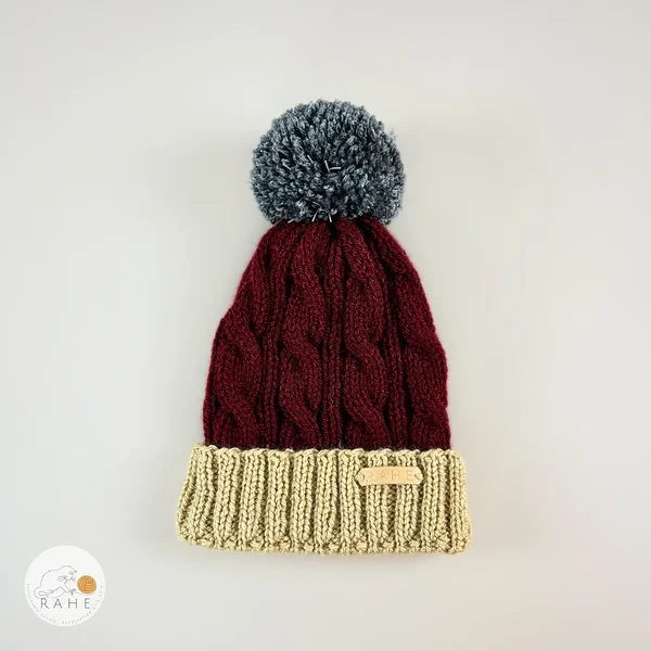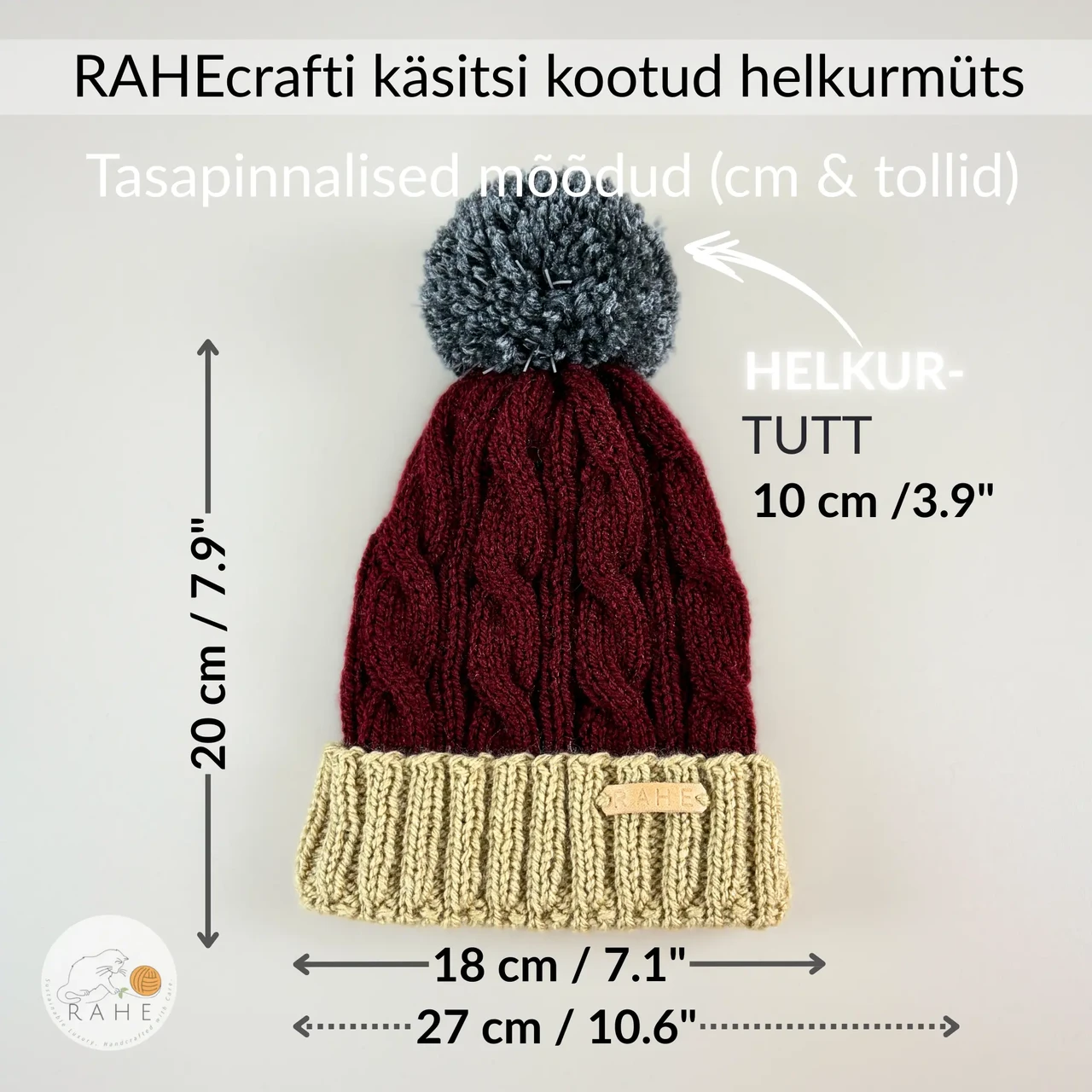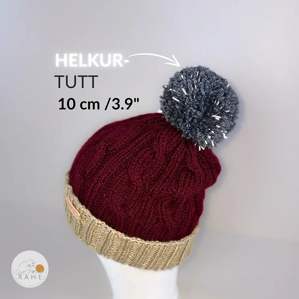Käsitsi kootud tumepunane palmikkoes akrüüllõngast talvemüts, millel on kõrvu eriti hästi soojas hoidev kahekordne beež soonikäär ja mida kaunistab pehme ja suur hall helkurtutt. See kootud tutimüts, mis on mõeldud nii poistele kui ka tüdrukutele, sobib samuti teismelistele.