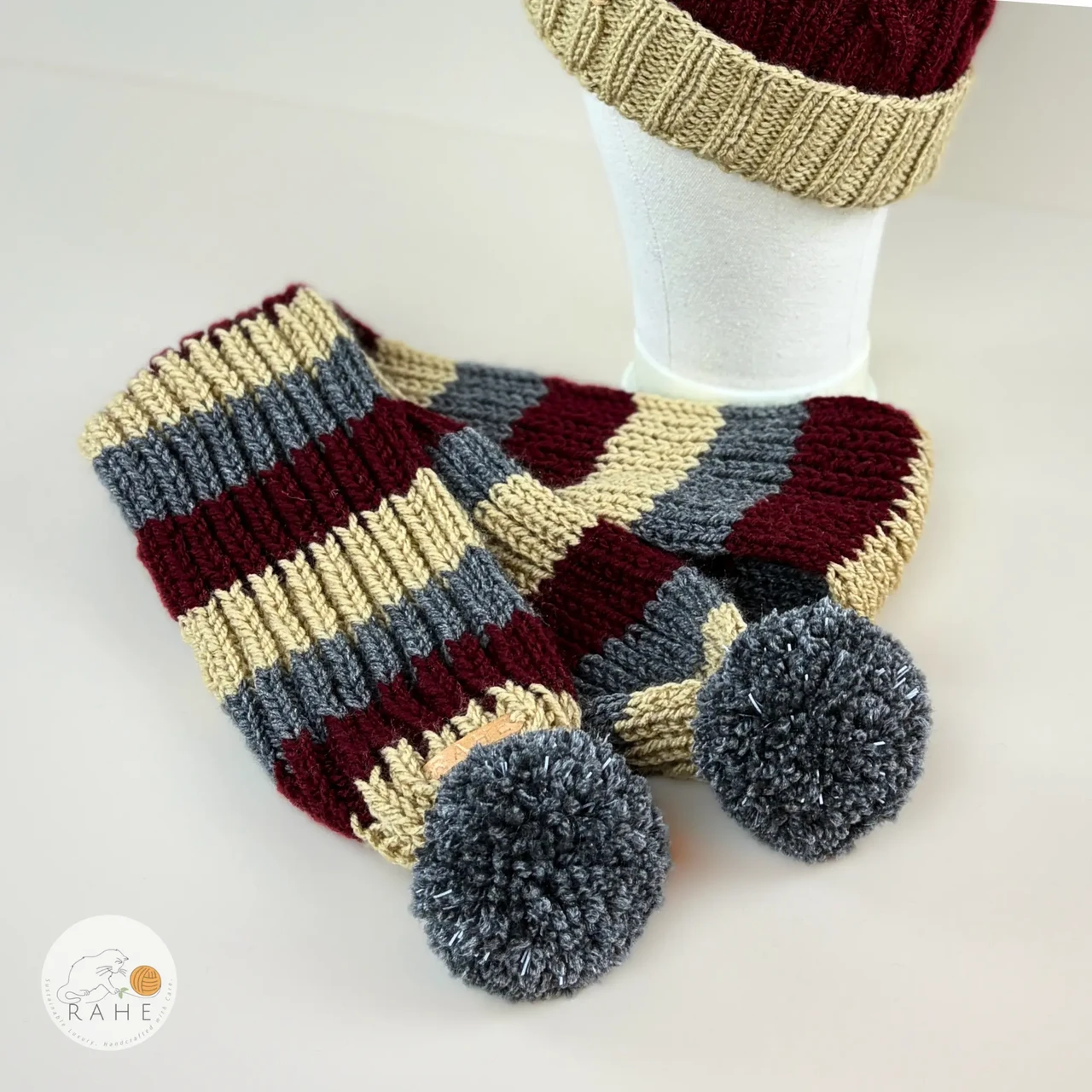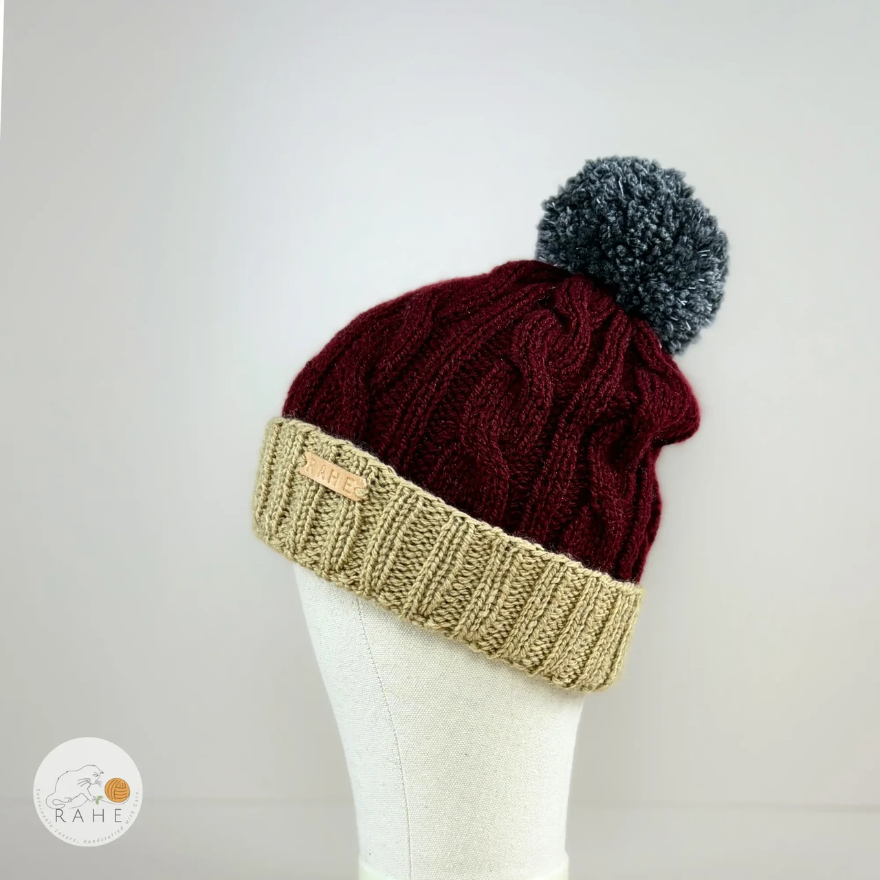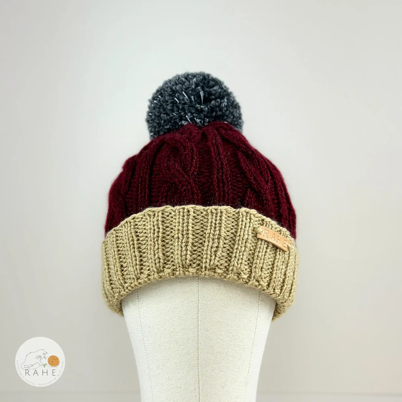 Käsitsi kootud tumepunane palmikkoes akrüüllõngast talvemüts, millel on kõrvu eriti hästi soojas hoidev kahekordne beež soonikäär ja mida kaunistab pehme ja suur hall helkurtutt. See kootud tutimüts, mis on mõeldud nii poistele kui ka tüdrukutele, sobib samuti teismelistele.