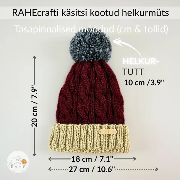 Mütsi kõrgus 20 cm/ 7.9" (mõõdetud ilma tutita)