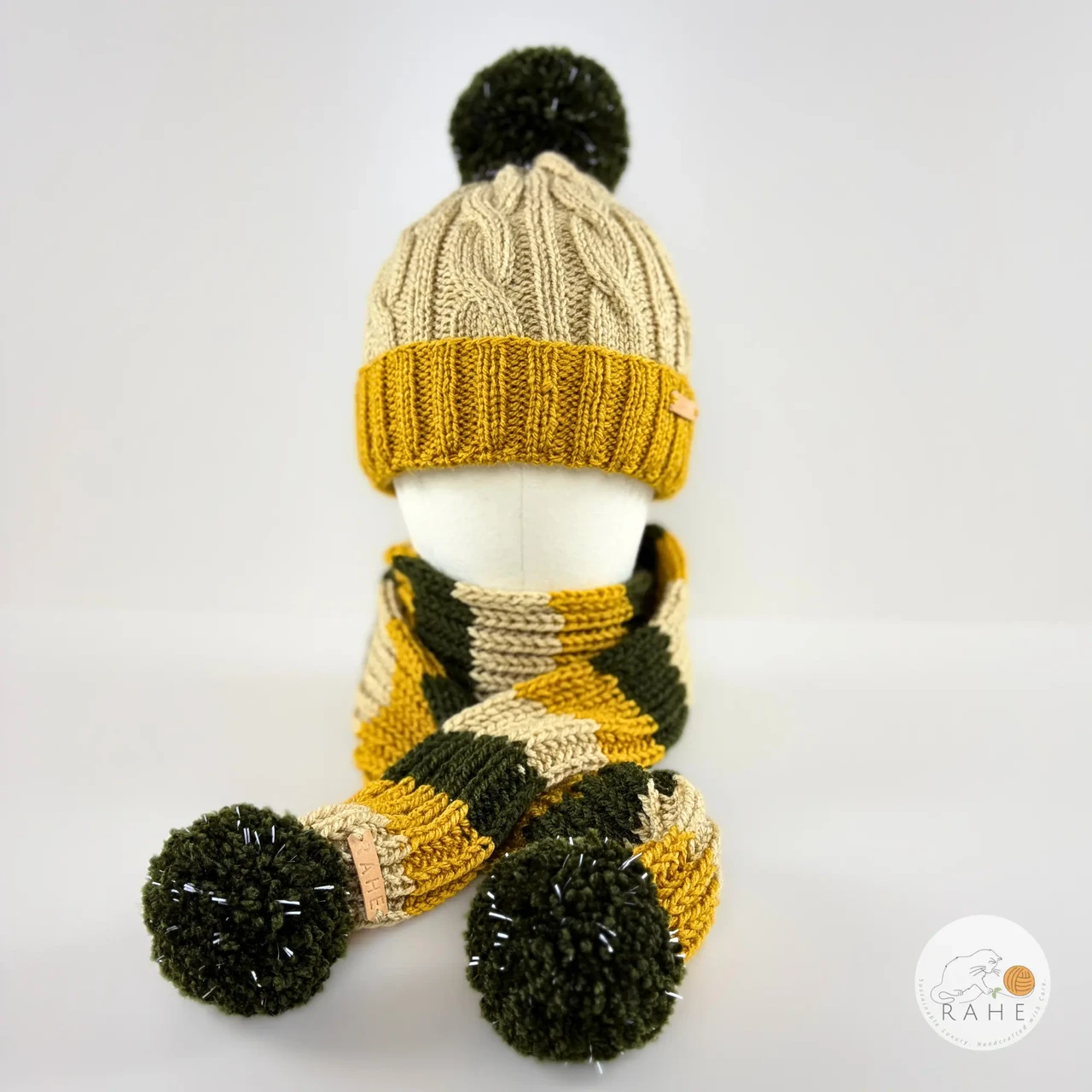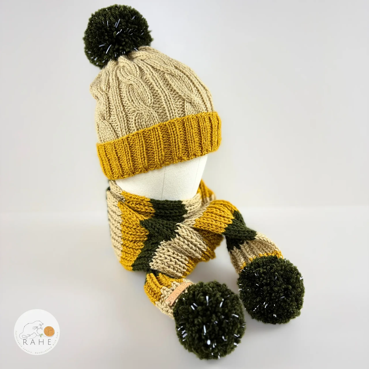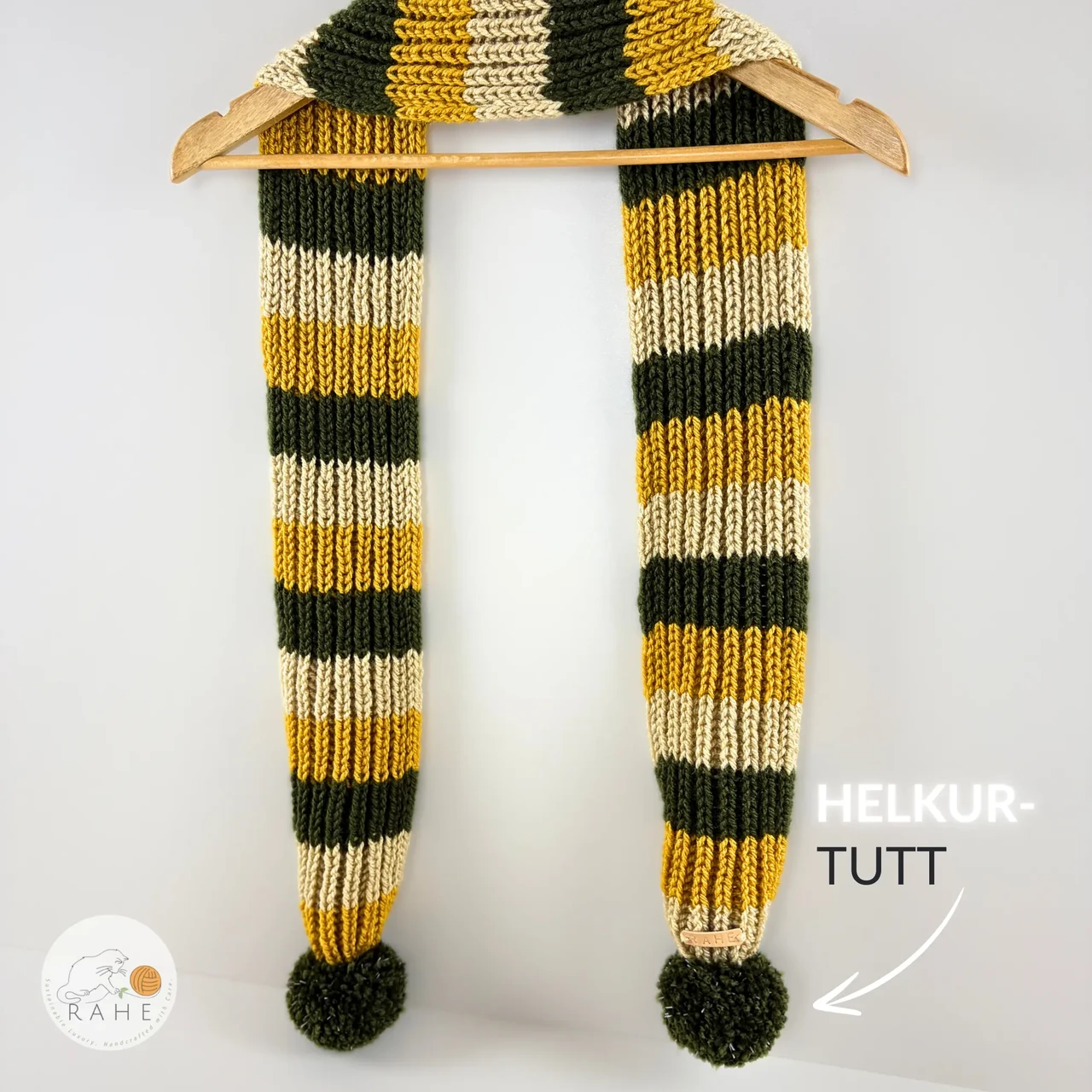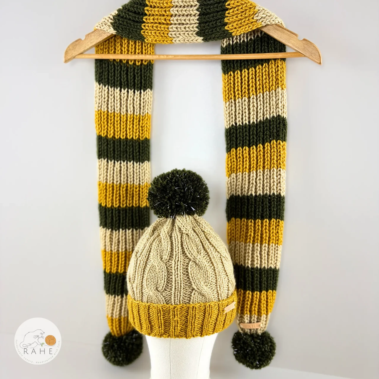 Käsitsi kootud triibuline sall helkurtuttidega - beež, sinepikollane, tumeroheline