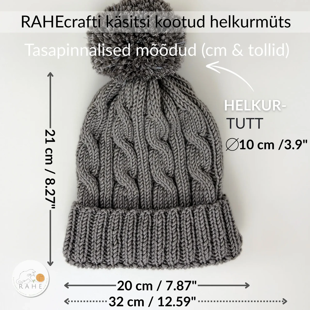 Käsitsi kootud tumehalli palmikkirjaga meriinovillane lastemüts, millel on kõrvu eriti hästi soojas hoidev kahekordne soonikäär ja mida kaunistab pehme ja suur samatooniline helkurtutt.