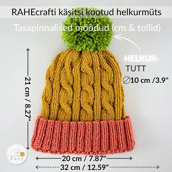 Mõõdud on võetud tasapinnalise mütsi järgi. Täieliku ümbermõõdu saamiseks korruta laius kahega — sobib mugavalt kuni umbes 52 cm