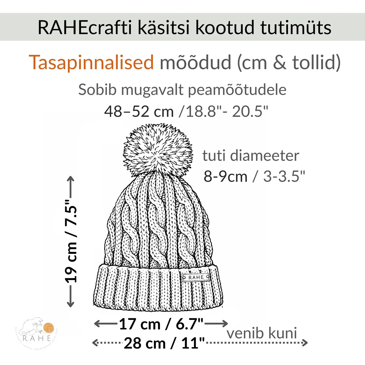 Ajatu ja praktiline käsitsi kootud laste tutimüts, mis ühendab sooja meriinovilla, mugava istuvuse ja klassikalise disaini. Pehme kunstkarvast tutt ning palmikkude lisavad detaili, mis teeb sellest mütsist kindla valiku jahedamateks päevadeks.