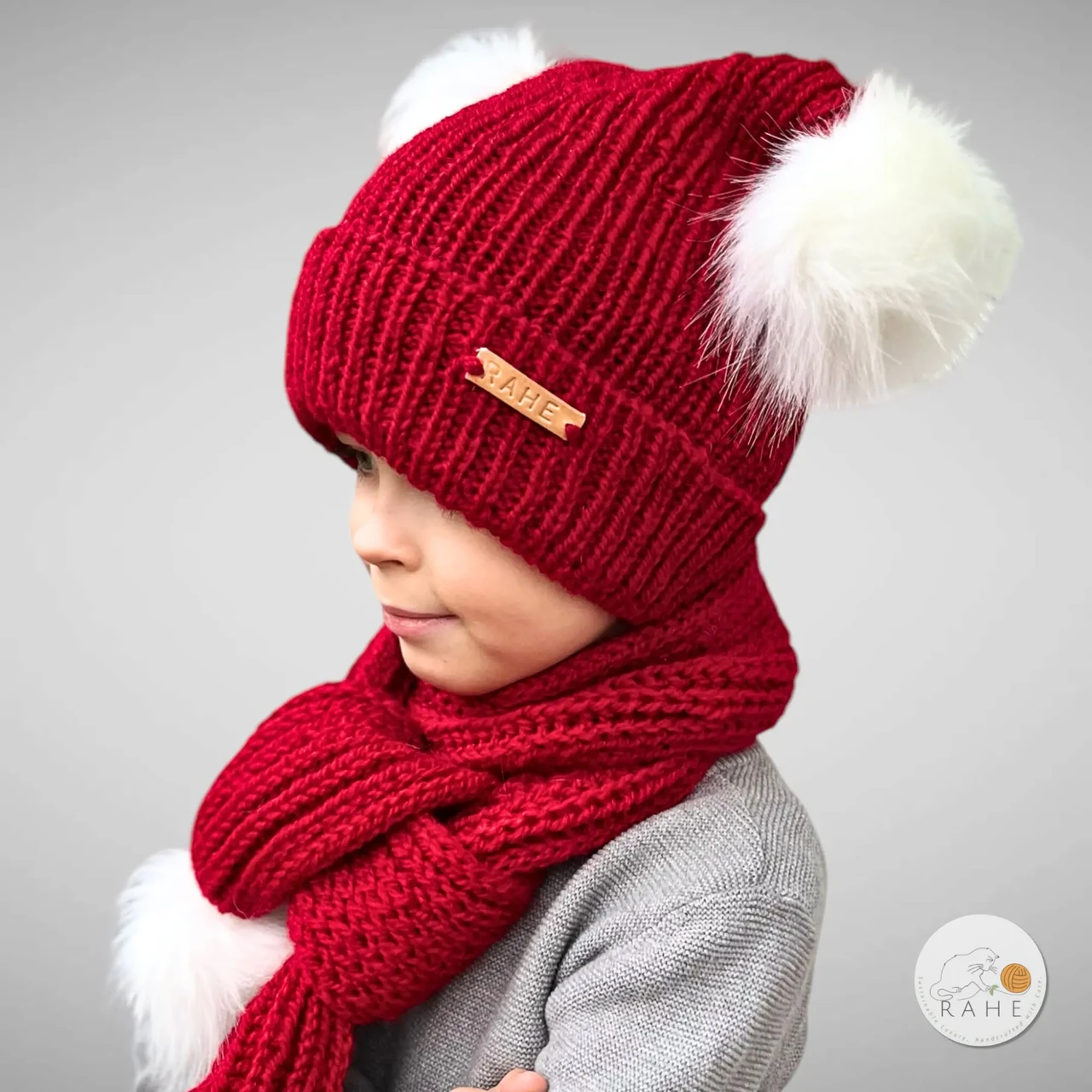 See kaunis punane käsitsi kootud müts ja sall on valmistatud pehmest villasegust, kaunistatud kohevate kunstkarva tuttidega. Alguses lastele disainitud talvemüts sobib üllatavalt hästi ka teismelistele ja täiskasvanutele, sest see eesti käsitöö kudum on pehme ja veniv.