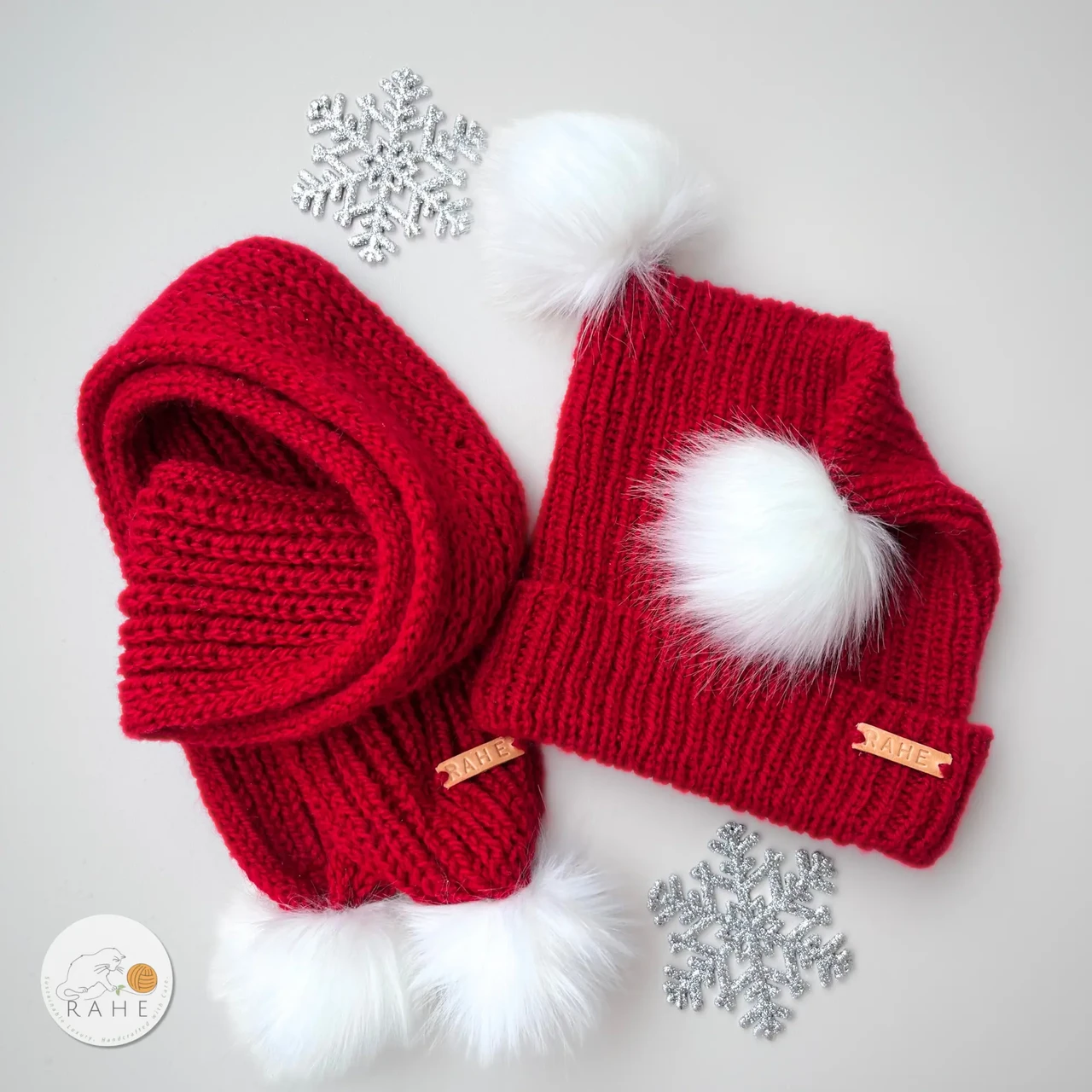 Käsitsi kootud punase talvemütsi ja salli komplekt lastele ja täiskasvanutele.