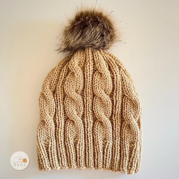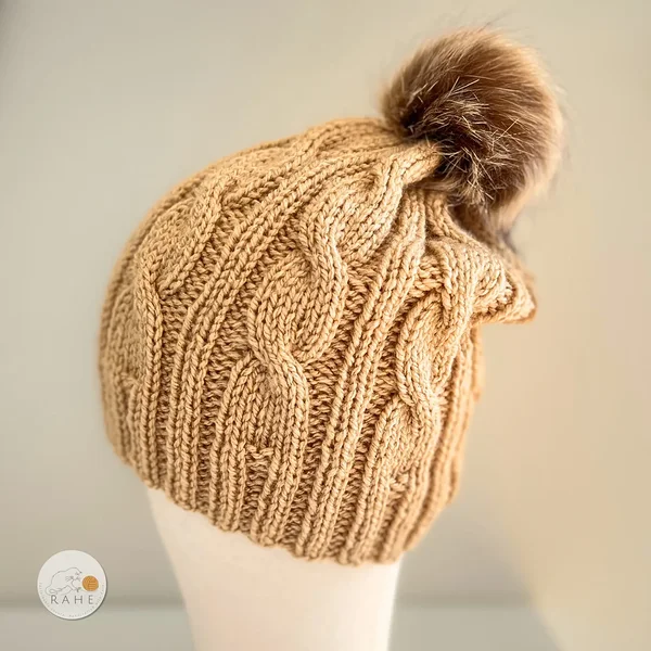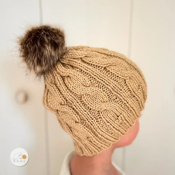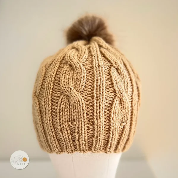See beež palmikkoes müts on hubane ja ajatu valik, kus on mugav soonikäär, efektne muster ja loomasõbralik pruun kunstkarvast tutt.