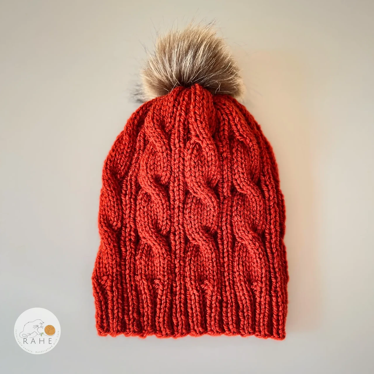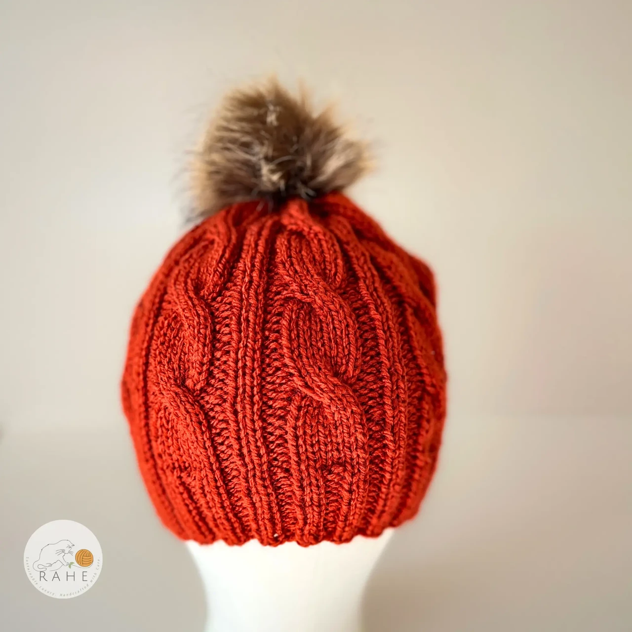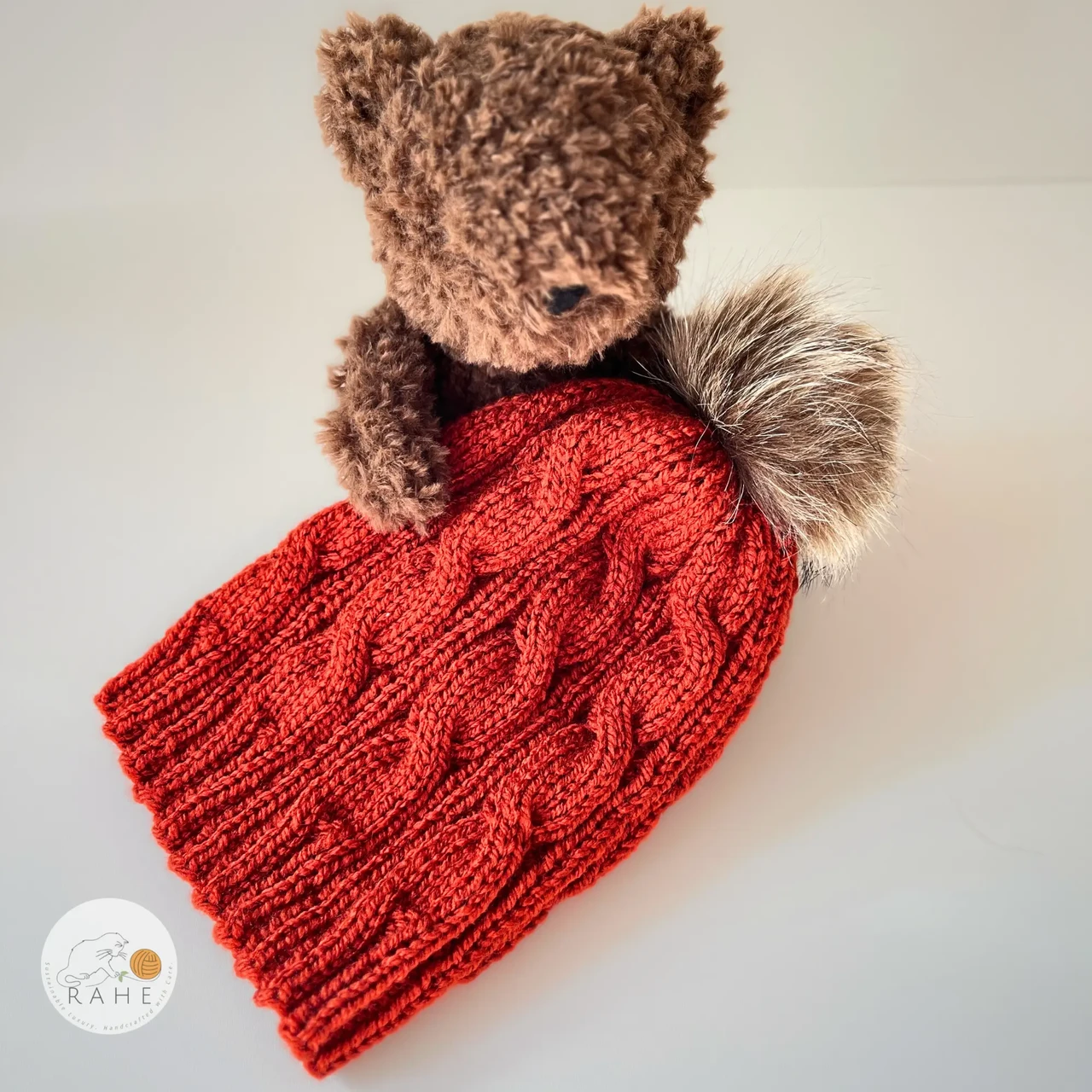See punakaspruun palmikutega müts on hubane ja ajatu valik, millel on mugav soonikäär, efektne muster ja loomasõbralik pruun kunstkarvast tutt.